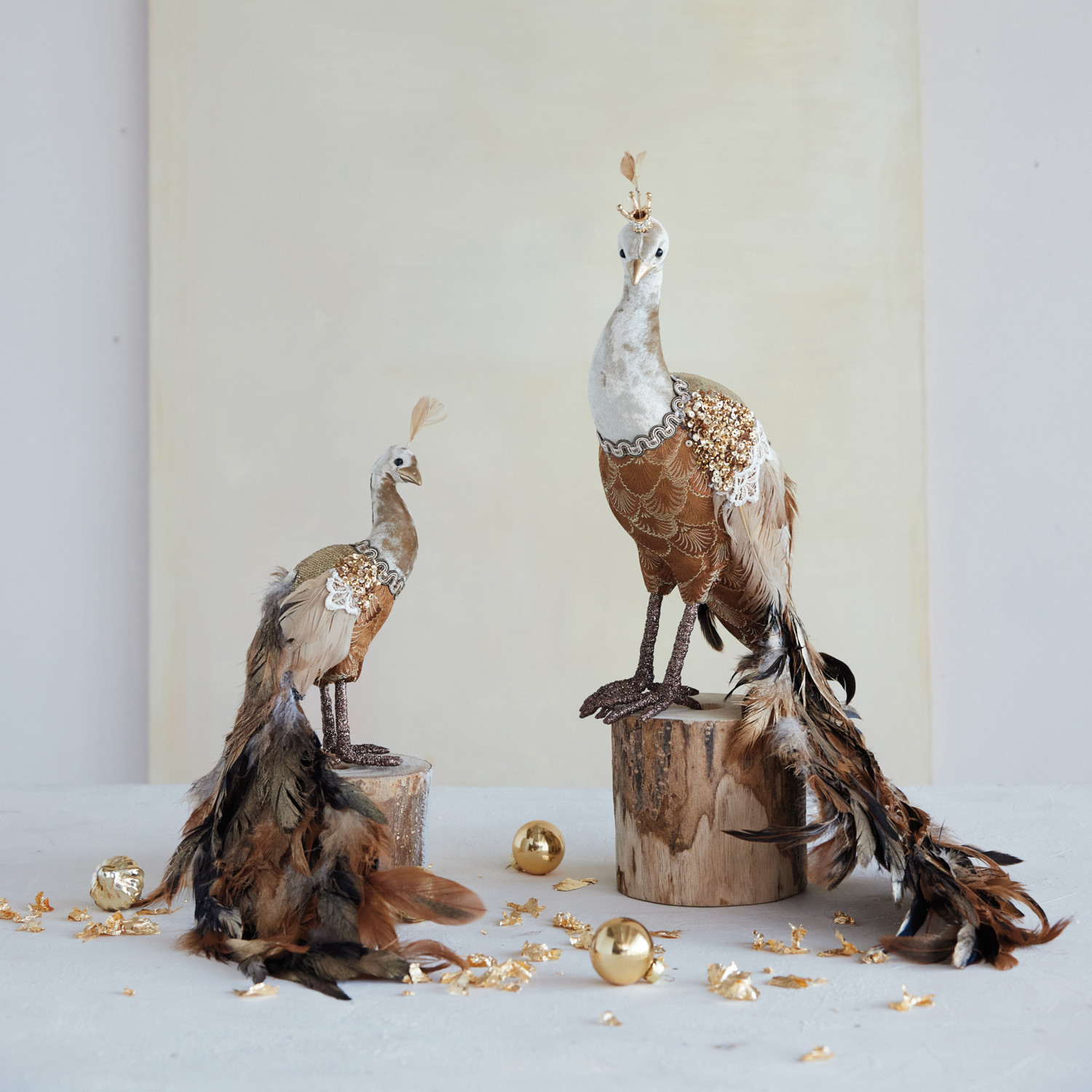 Catalog Name: 9-1/2"L x 4-3/4"W x 10"H Foam & Fabric Peacock w/ Sequins & Feathers, Brown