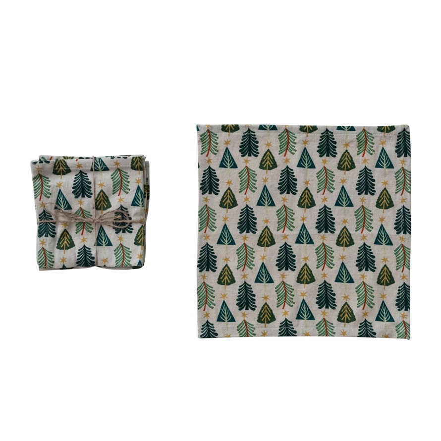 Cotton & Linen Printed Cocktail Napkins with Tree Pattern, Set of 4 Tied with Jute ©