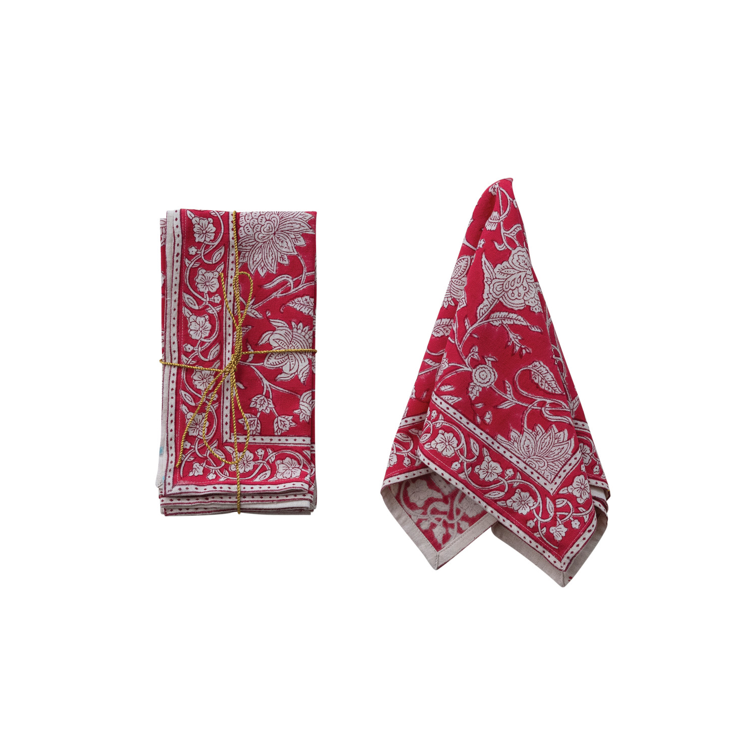 Cotton Block Print Napkins with Floral Pattern, Red & White, Set of 4 Tied with Gold Cord