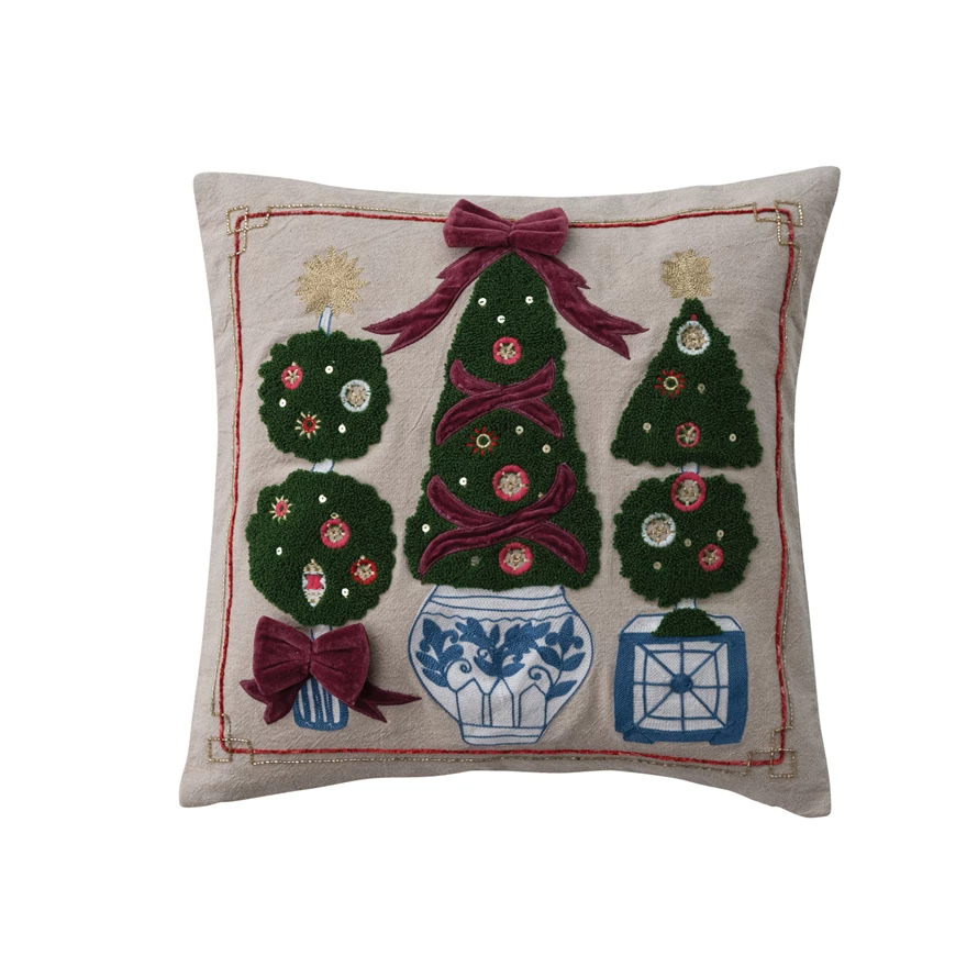 Catalog Name: 18" Square Cotton Chambray Pillow w/ Topiaries, Embroidery & Appliqued Velvet Bows, Multi Color