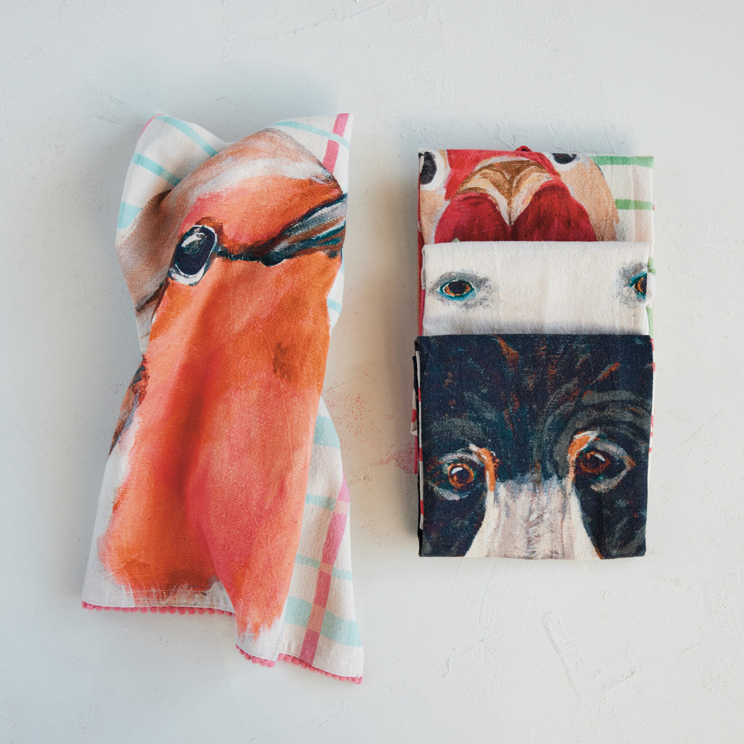 Cotton Chambray Printed Tea Towel with Holiday Pattern, Animal & Pom Pom Trim, 4 Styles ©