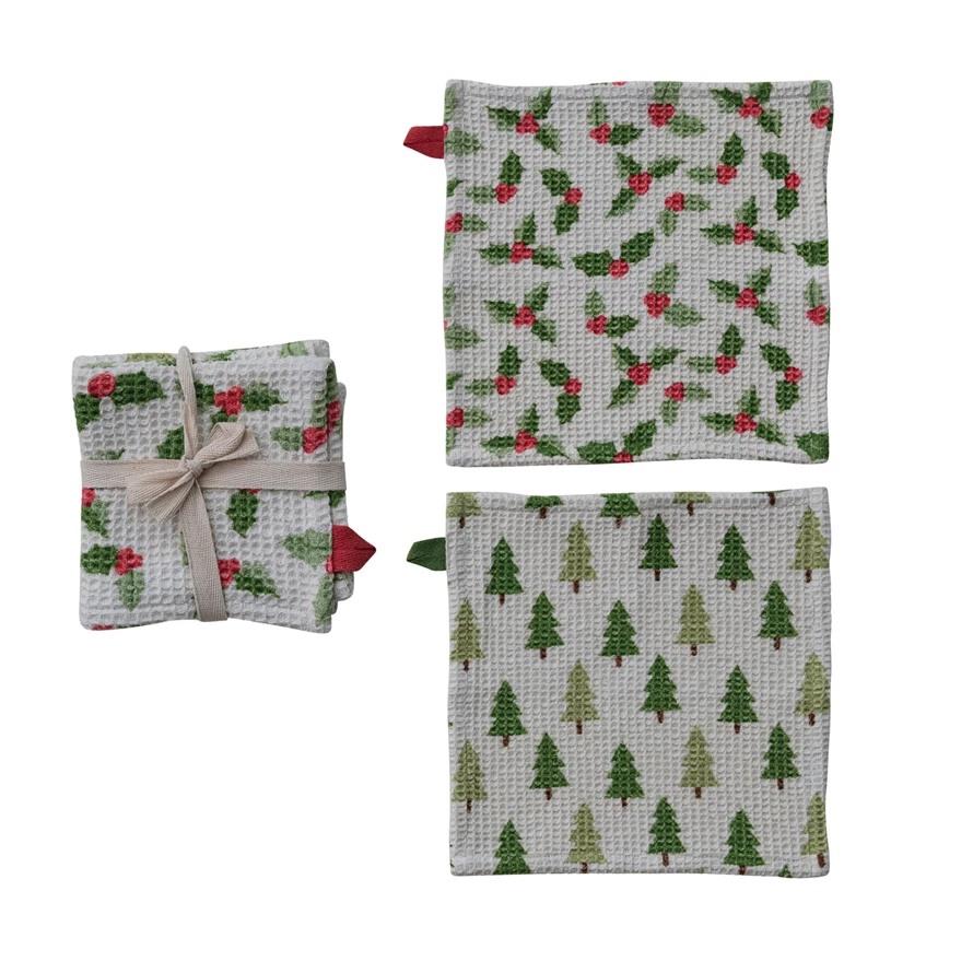 Catalog Name: 10-1/2" Square Cotton Printed Waffle Weave Dish Cloths w/ Tree/Holly Pattern, Natural, Green & Red, Set of 2 Tied w/ Cotton Tape