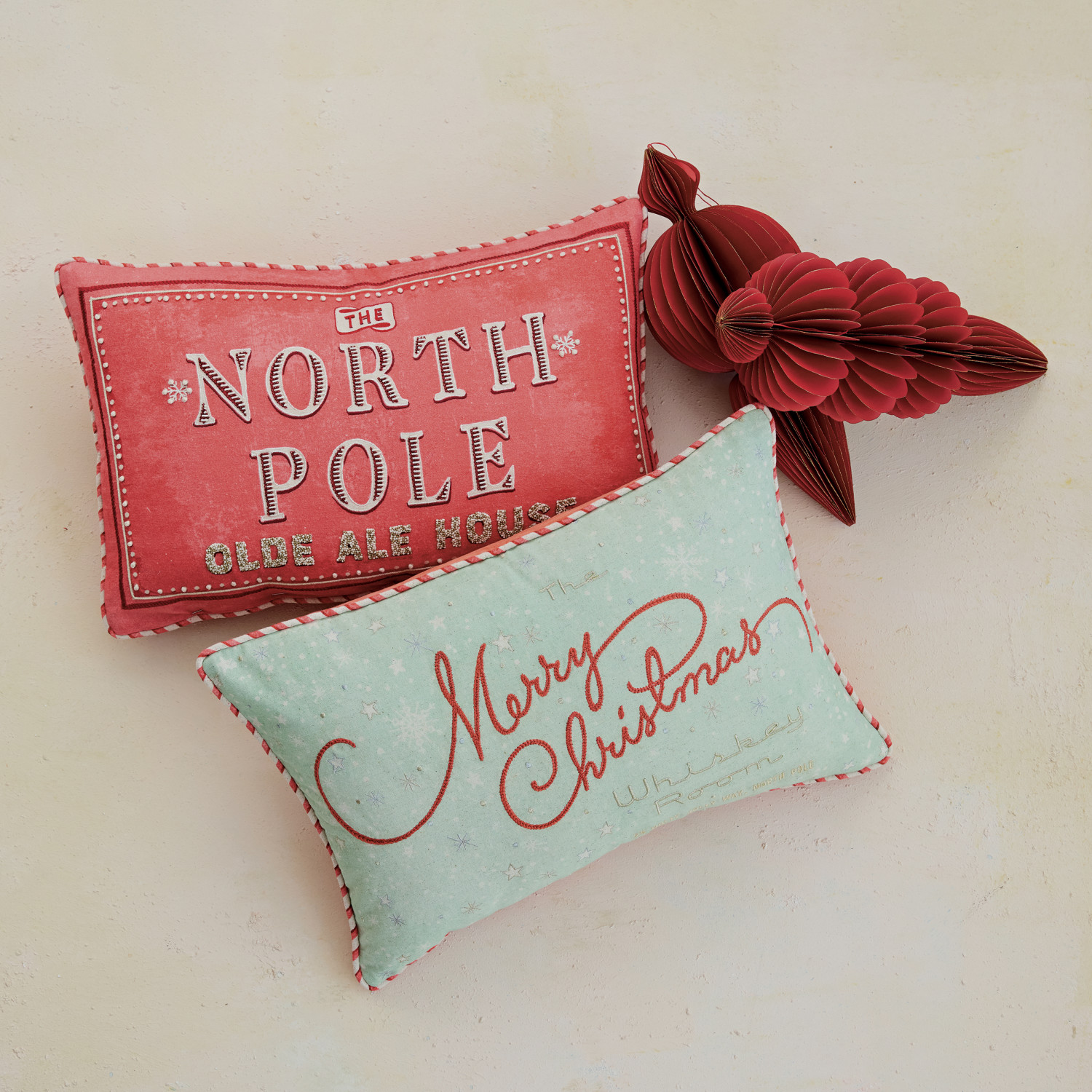 Catalog Name: 24"L x 16"H Cotton & Linen Printed Lumbar Pillow w/ Metallic Silver Thread, Embroidery, Striped Piping & Velvet Back "The Merry Christmas...", Multi Color ©