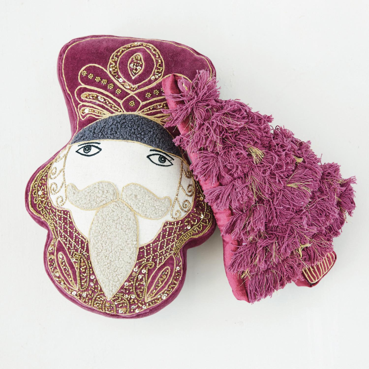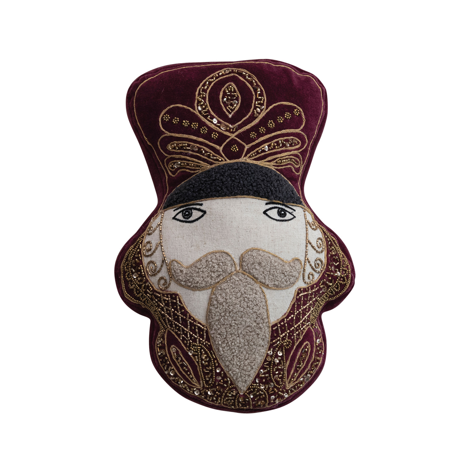 Catalog Name: 8"L x 14"H Hand-Woven Cotton Velvet Nutcracker Head Shaped Pillow w/ Faux Sherpa Tufting, Applique, Embroidery & Beads, Burgundy, Gold & Cream Color