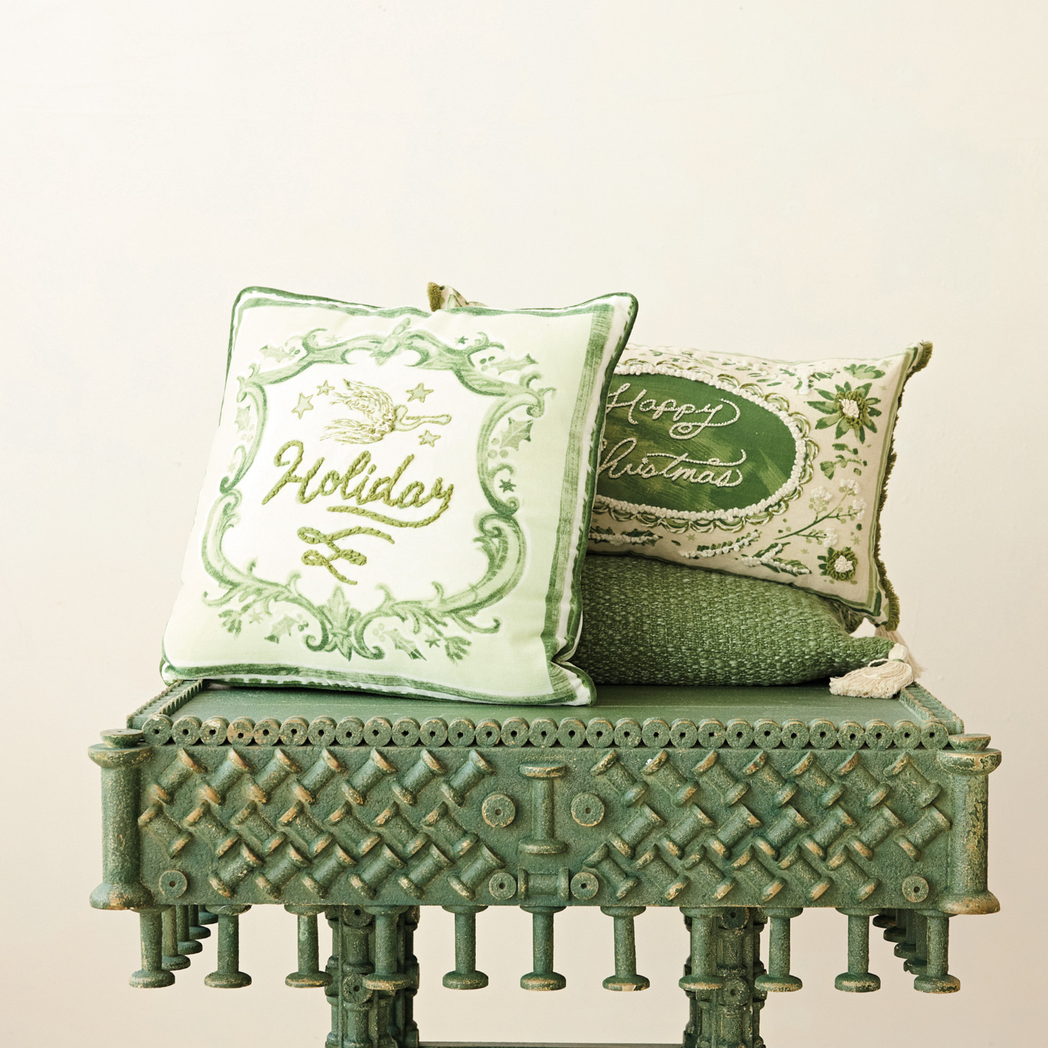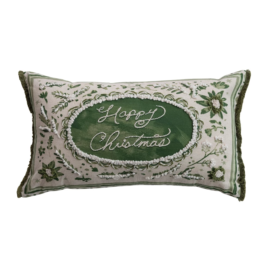 Catalog Name: 24"L x 14"H Cotton & Linen Printed Lumbar Pillow w/ Flowers, Embroidery, Beads, Eyelash Fringe & Holiday Patterned Back "Happy Christmas", Green & Cream Color ©