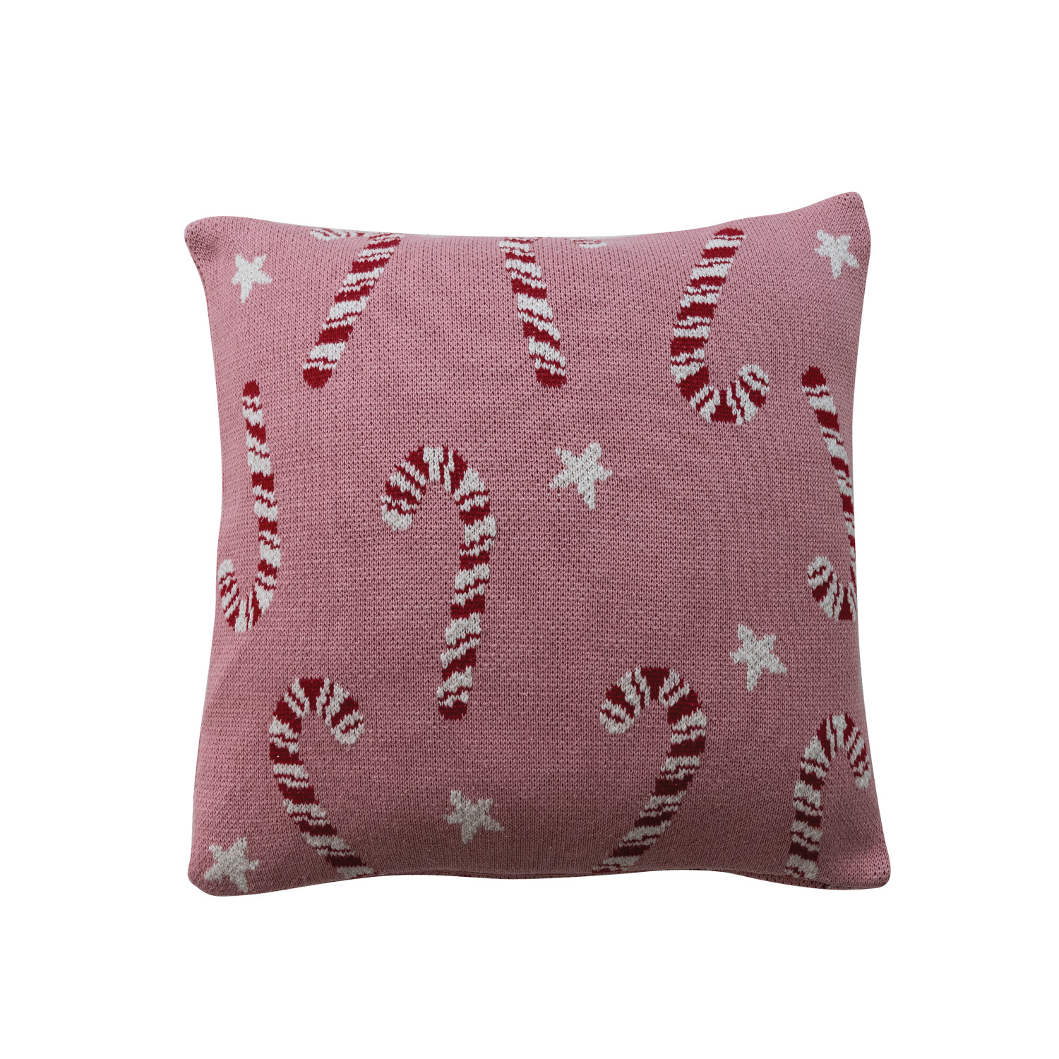 Catalog Name: 18" Square Cotton Knit Pillow w/ Candy Cane & Star Pattern, Pink, Red & White