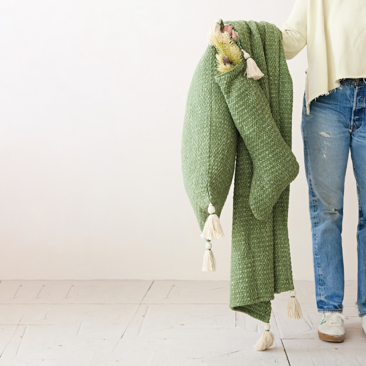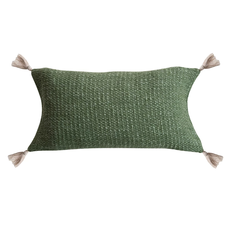 Catalog Name: 28"L x 14"H Stonewashed Woven Cotton Blend Slub Lumbar Pillow w/ Tassels, Green & Cream Color