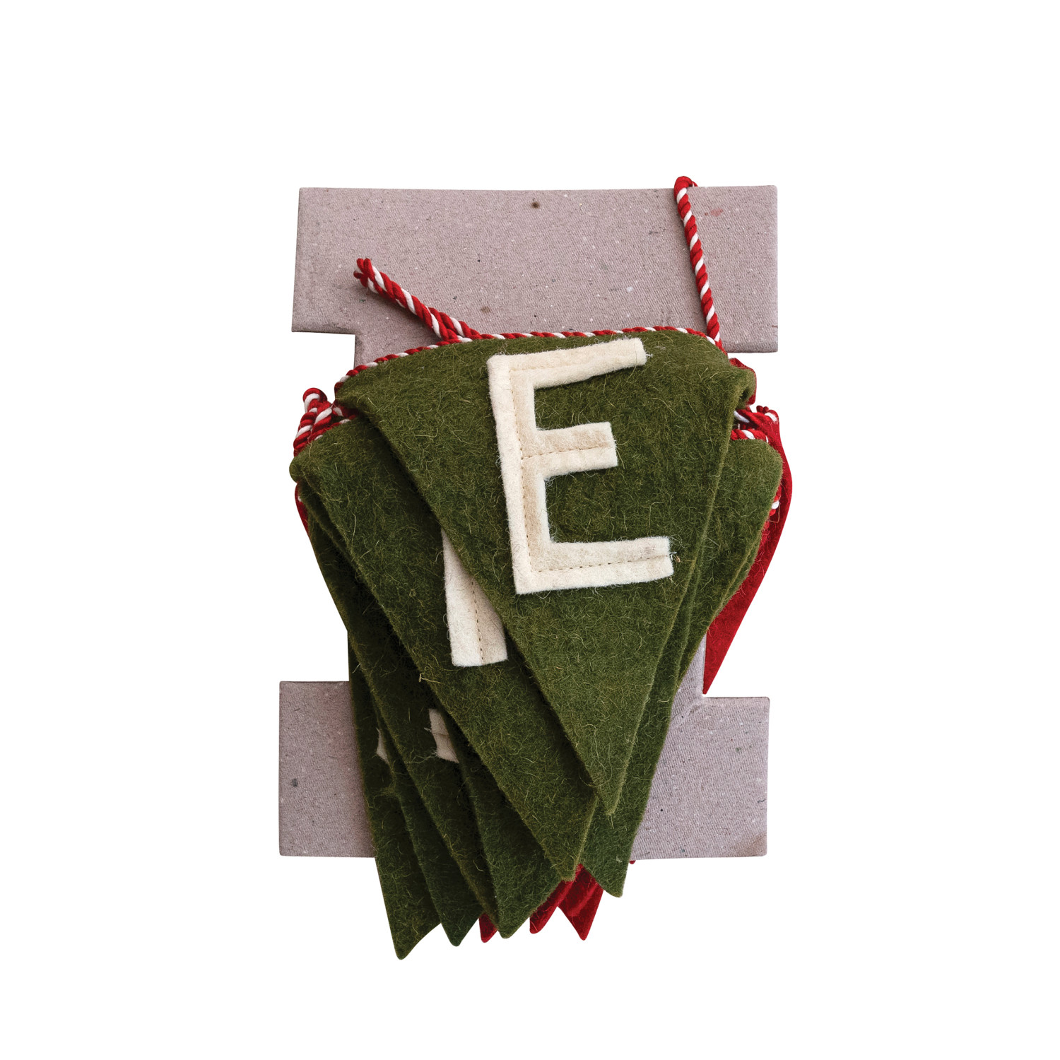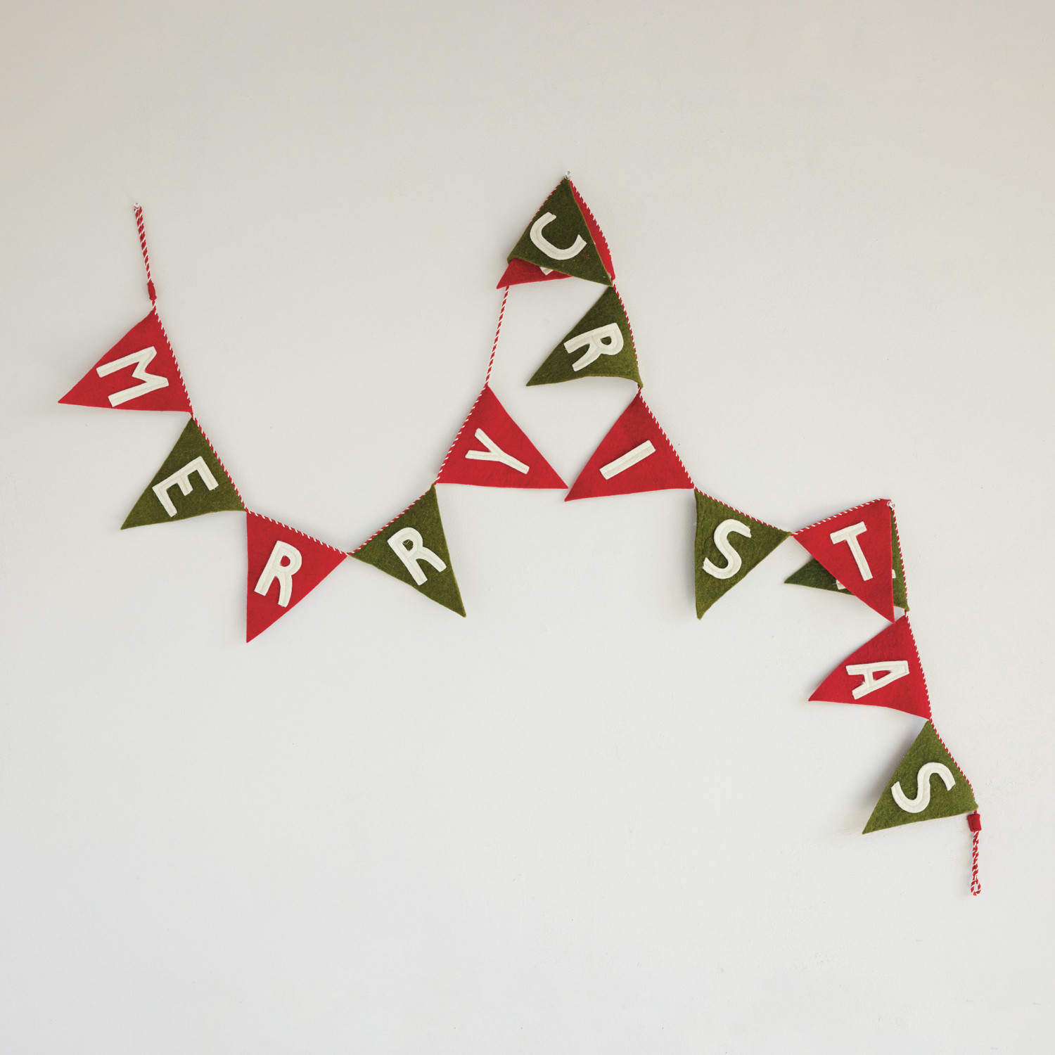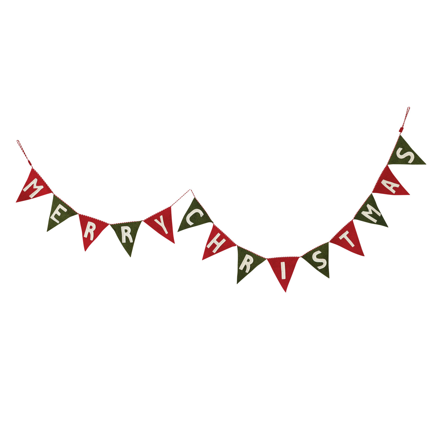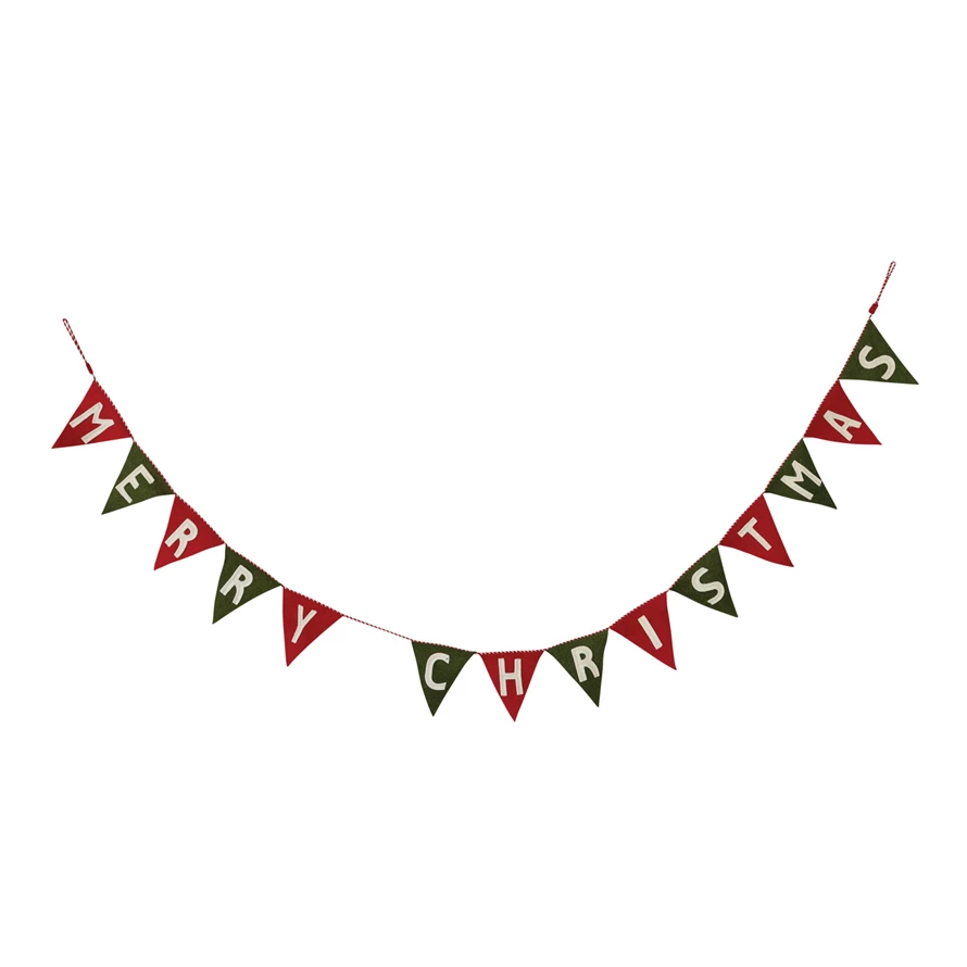 Catalog Name: 92"L x 6-3/4"H Handmade Wool Felt Pennant Banner "Merry Christmas" w/ Striped Cord, Red, Green & White