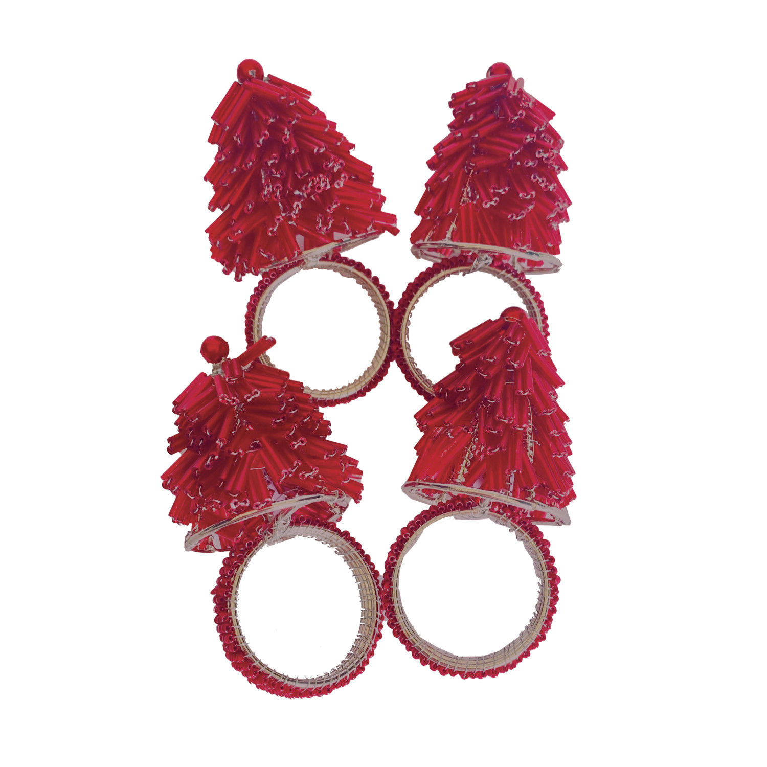 Handmade Metal & Glass Beaded Tree Napkin Rings, Red, Set of 4 Tied with Jute