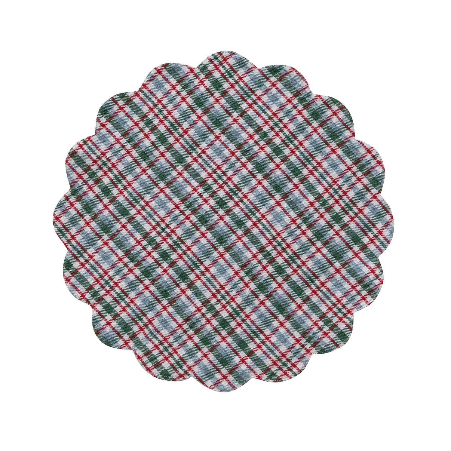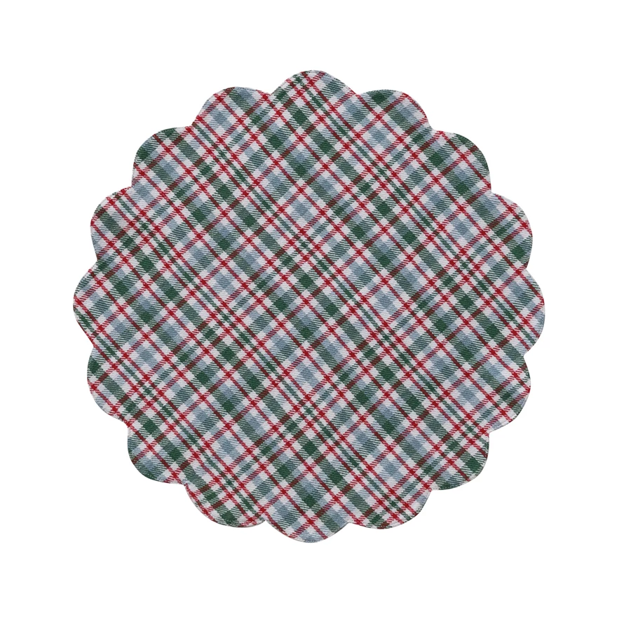 Catalog Name: 15" Round Woven Cotton Scalloped Placemat w/ Plaid Pattern, Multi Color