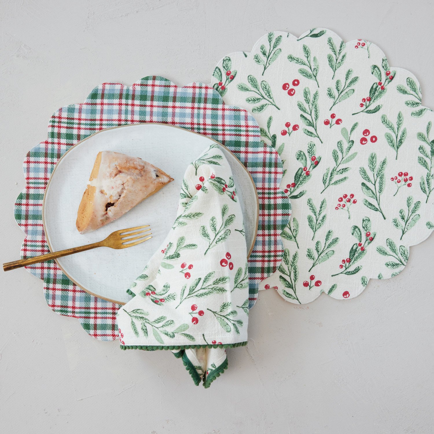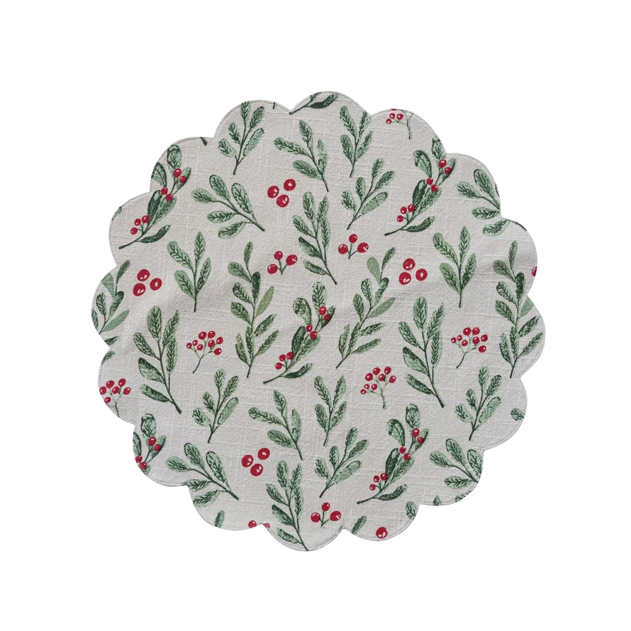 Woven Cotton Printed Scalloped Placemat with Mistletoe Pattern