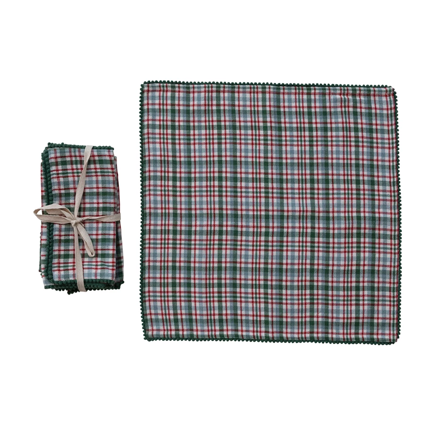 Woven Cotton Napkins with Plaid Pattern & Mini Pom Pom Trim, Set of 4 Tied with Cotton Tape
