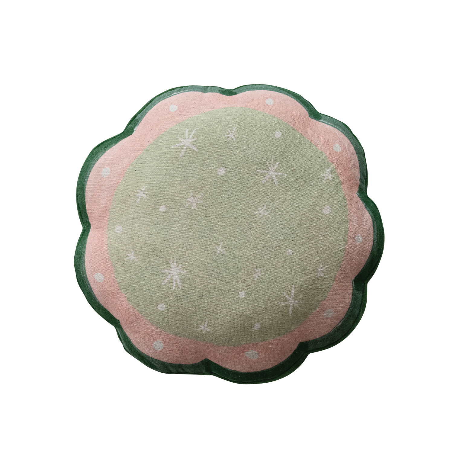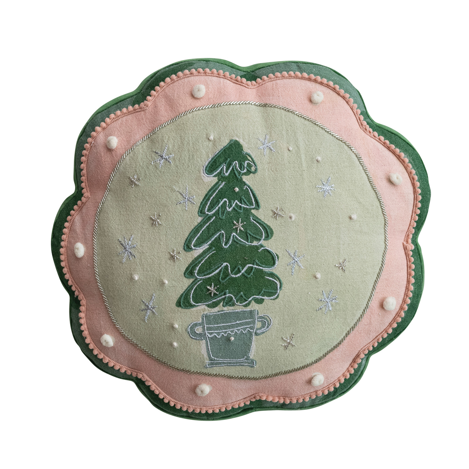 Catalog Name: 18" Round Cotton & Linen Scalloped Printed Pillow w/ Tree, Mini Pom Poms, Embroidery, Beads & Pom Pom Trim, Multi Color