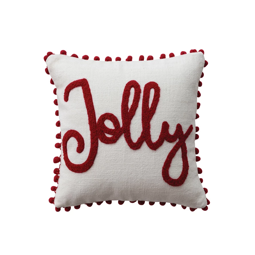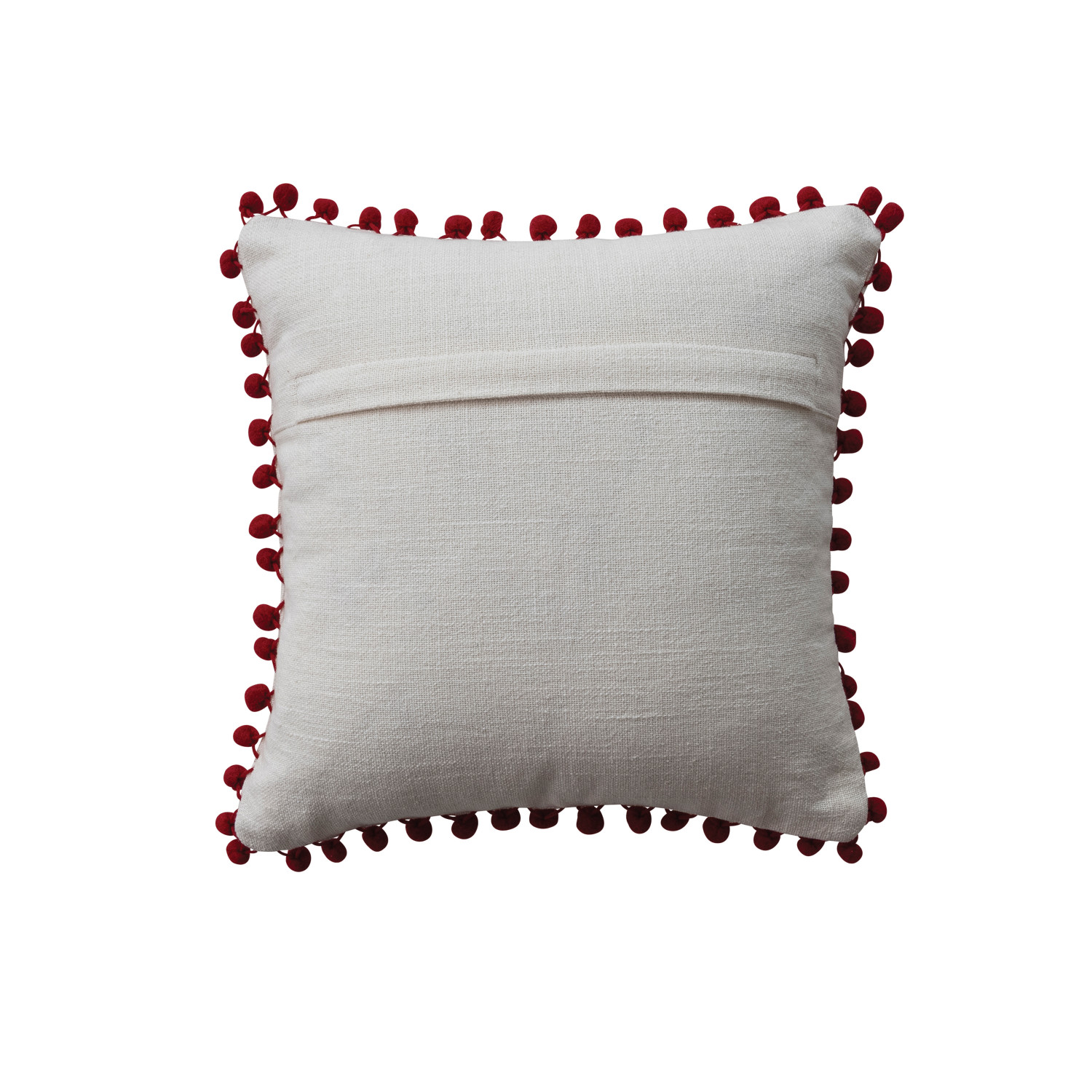12" Square Cotton Slub Pillow with Pom Pom Trim & Tufted "Jolly", White & Red