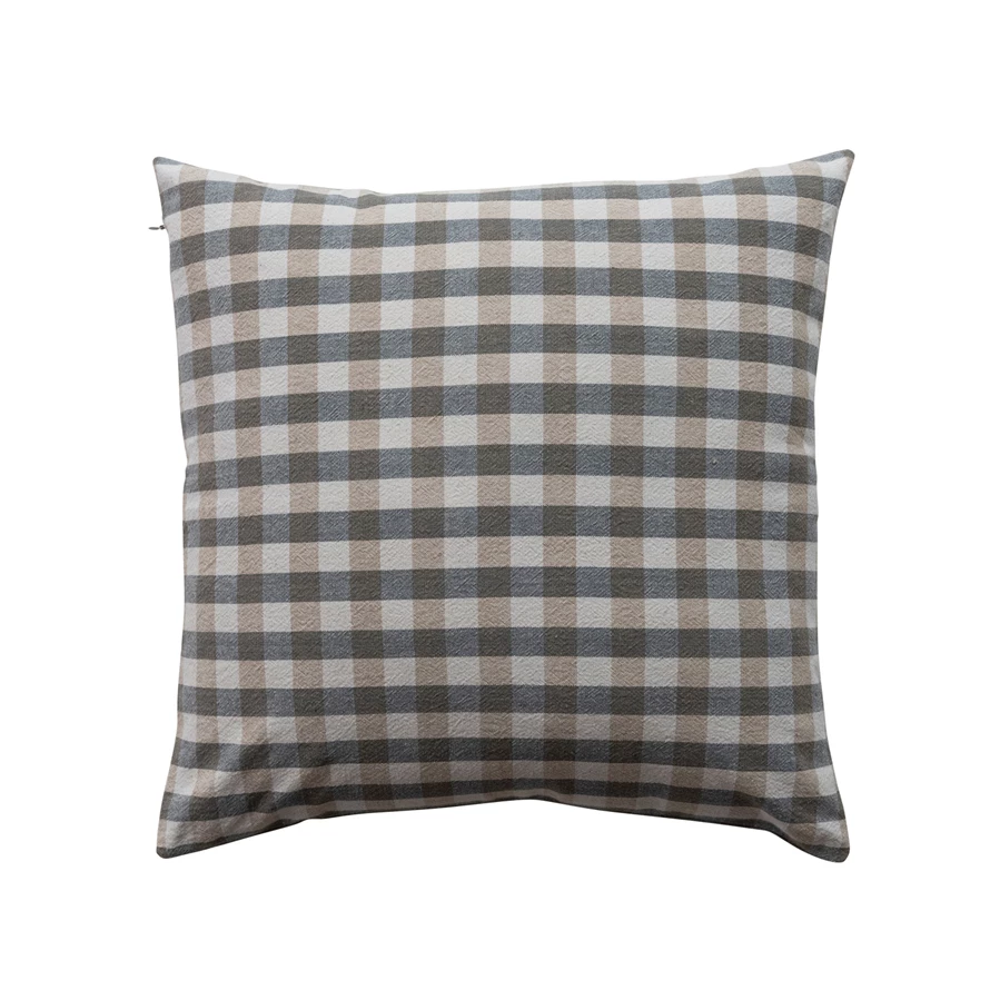 Catalog Name: 18" Square Woven Cotton Pillow w/ Check Pattern, Grey, Beige & Cream Color