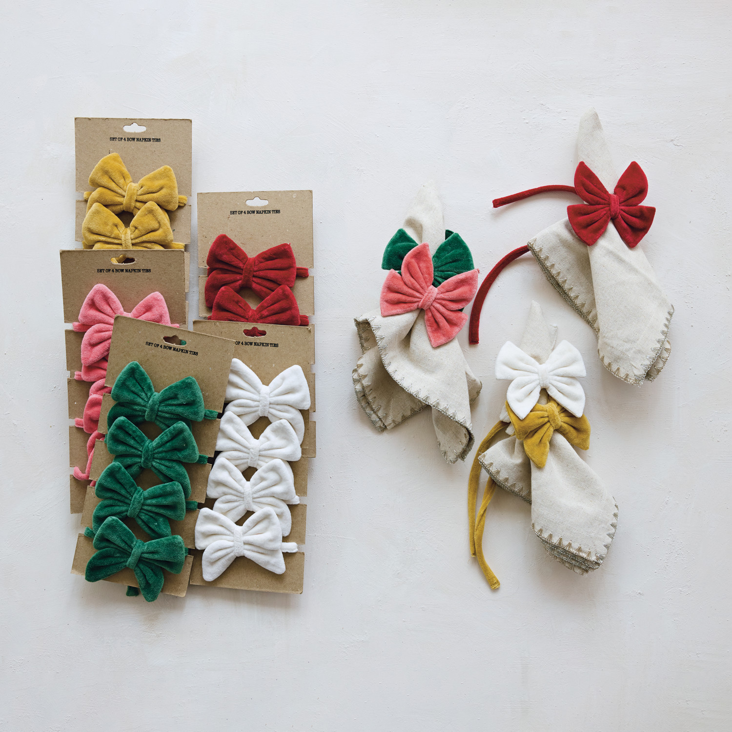 Cotton Velvet Bow Napkin Ties, Mustard Color, Set of 4 on Card