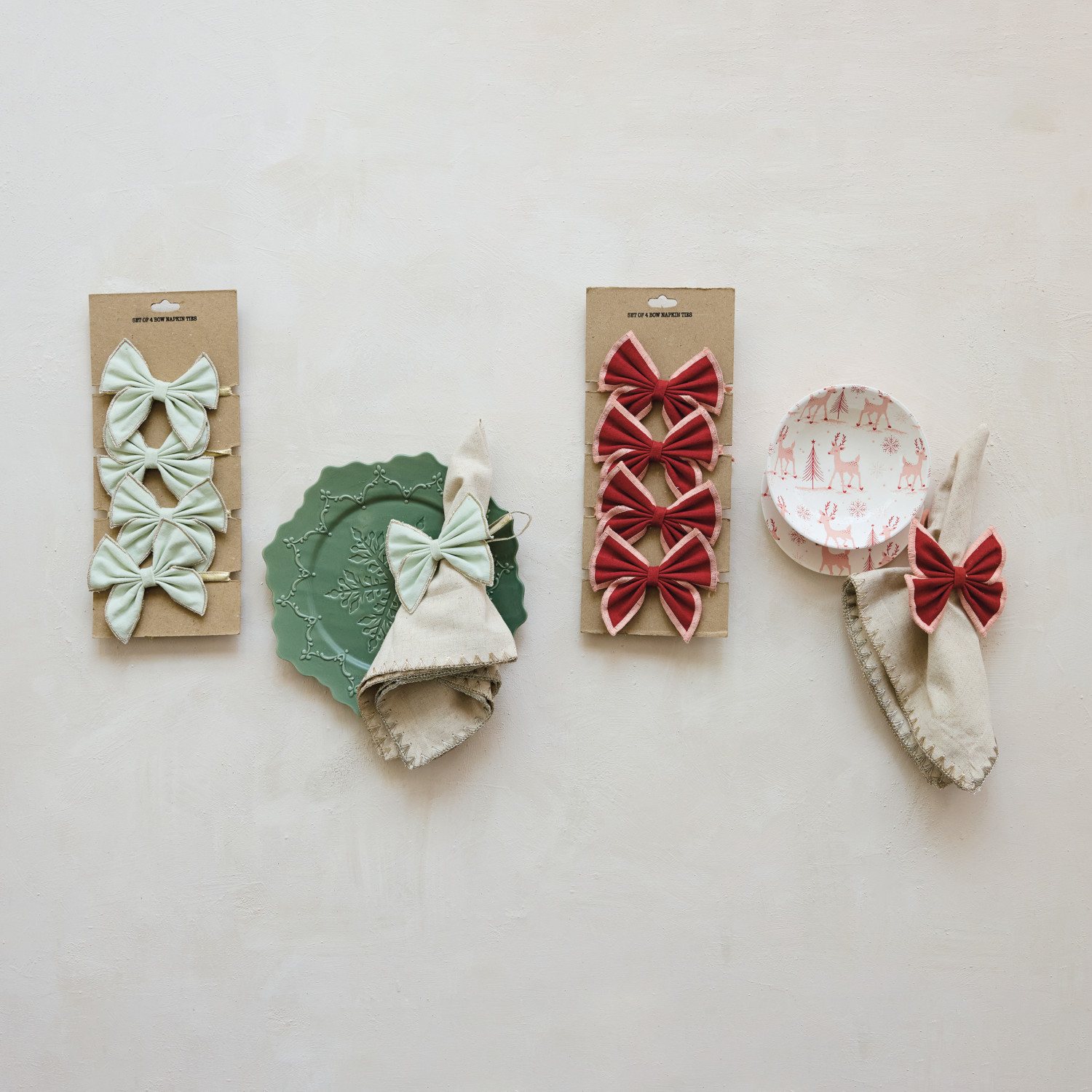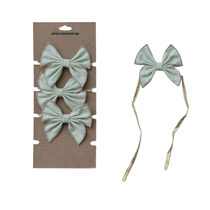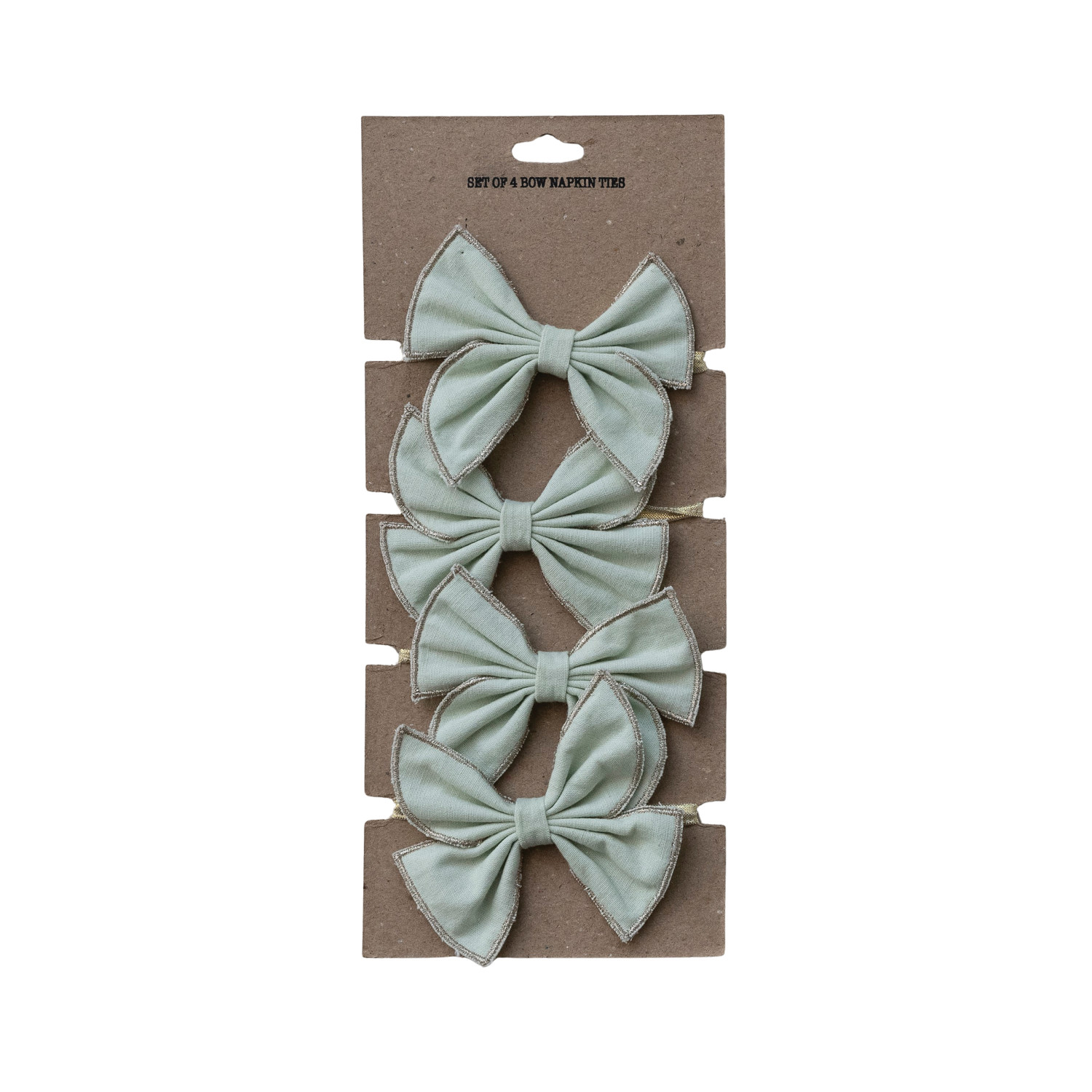 Cotton & Linen Bow Napkin Ties with Metallic Silver Thread Stitched Edges, Set of 4 on Card