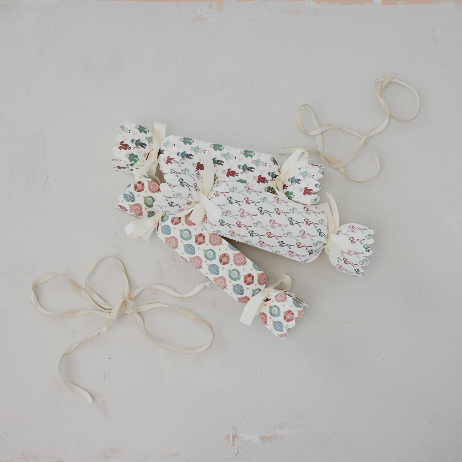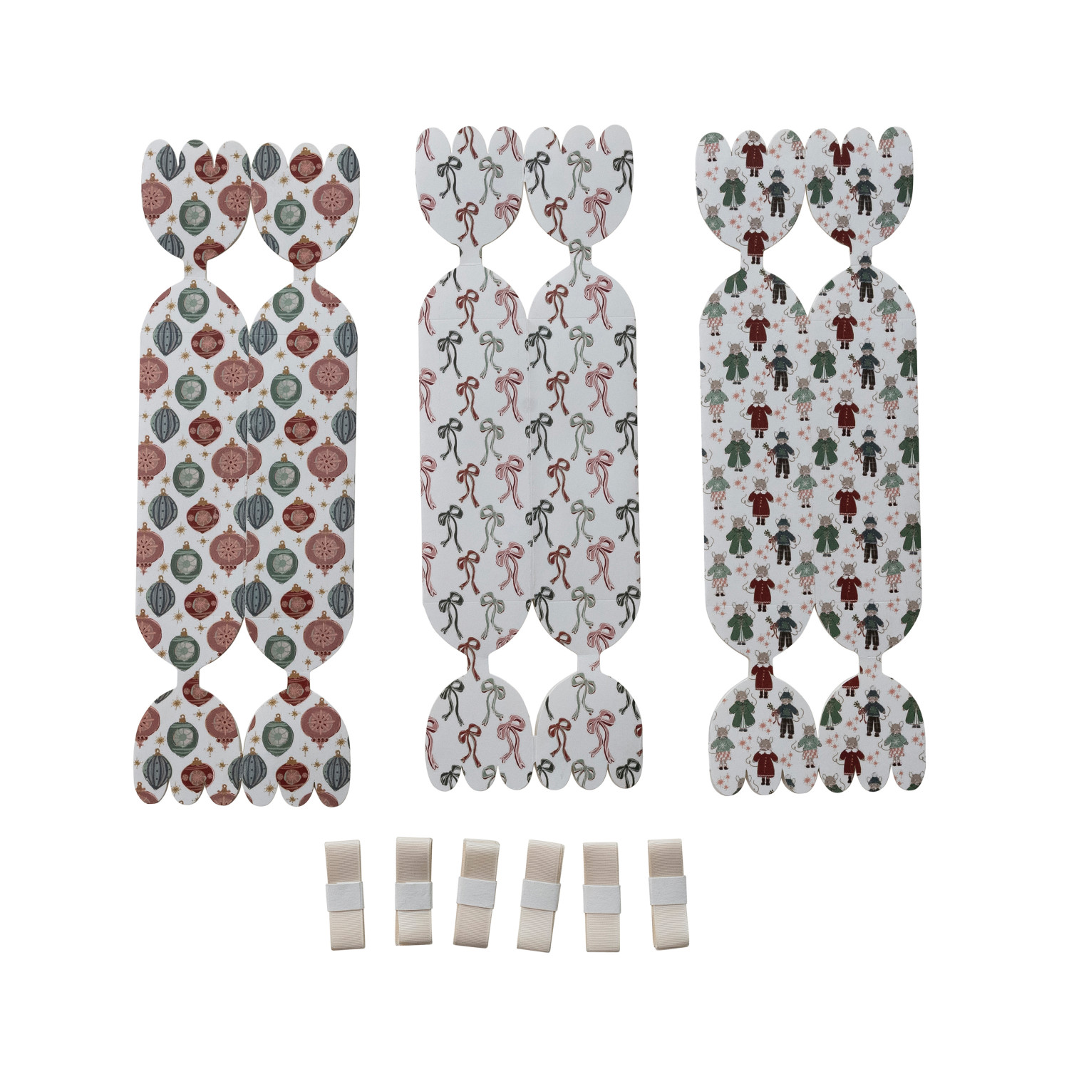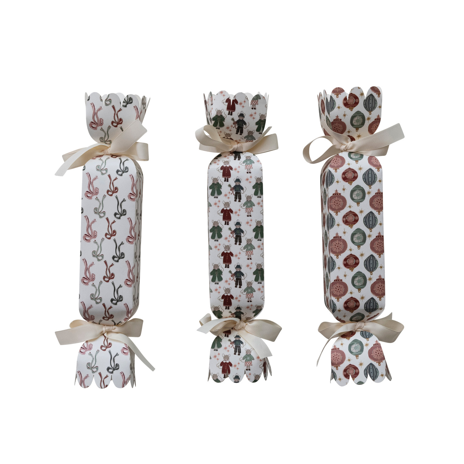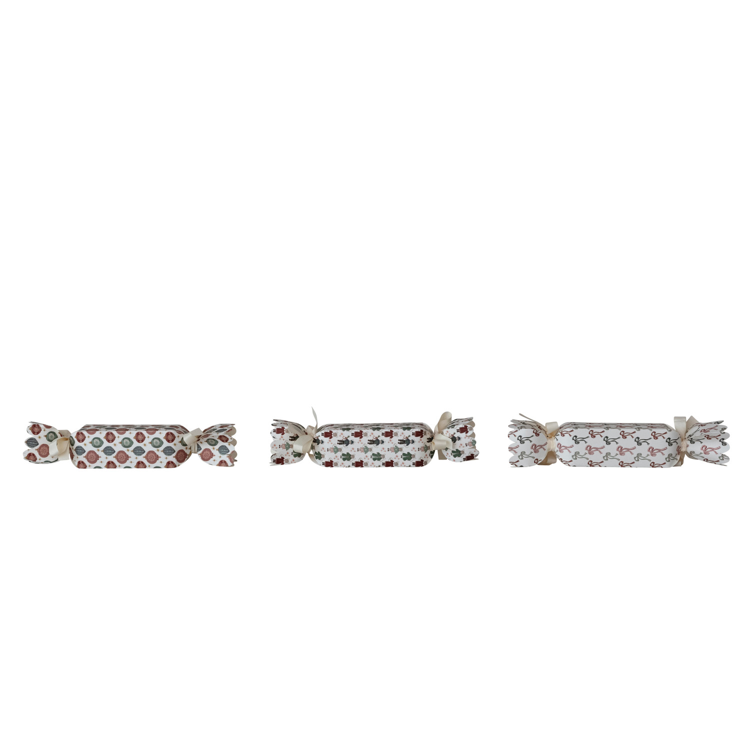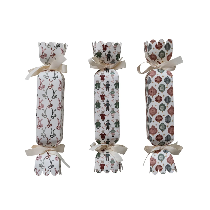 Catalog Name: 13-1/2"L x 2-1/2"W Handmade Printed Recycled Paper Candy Shaped Gift Box w/ Holiday Pattern & Ribbon Ties, Multi Color, 3 Styles ©