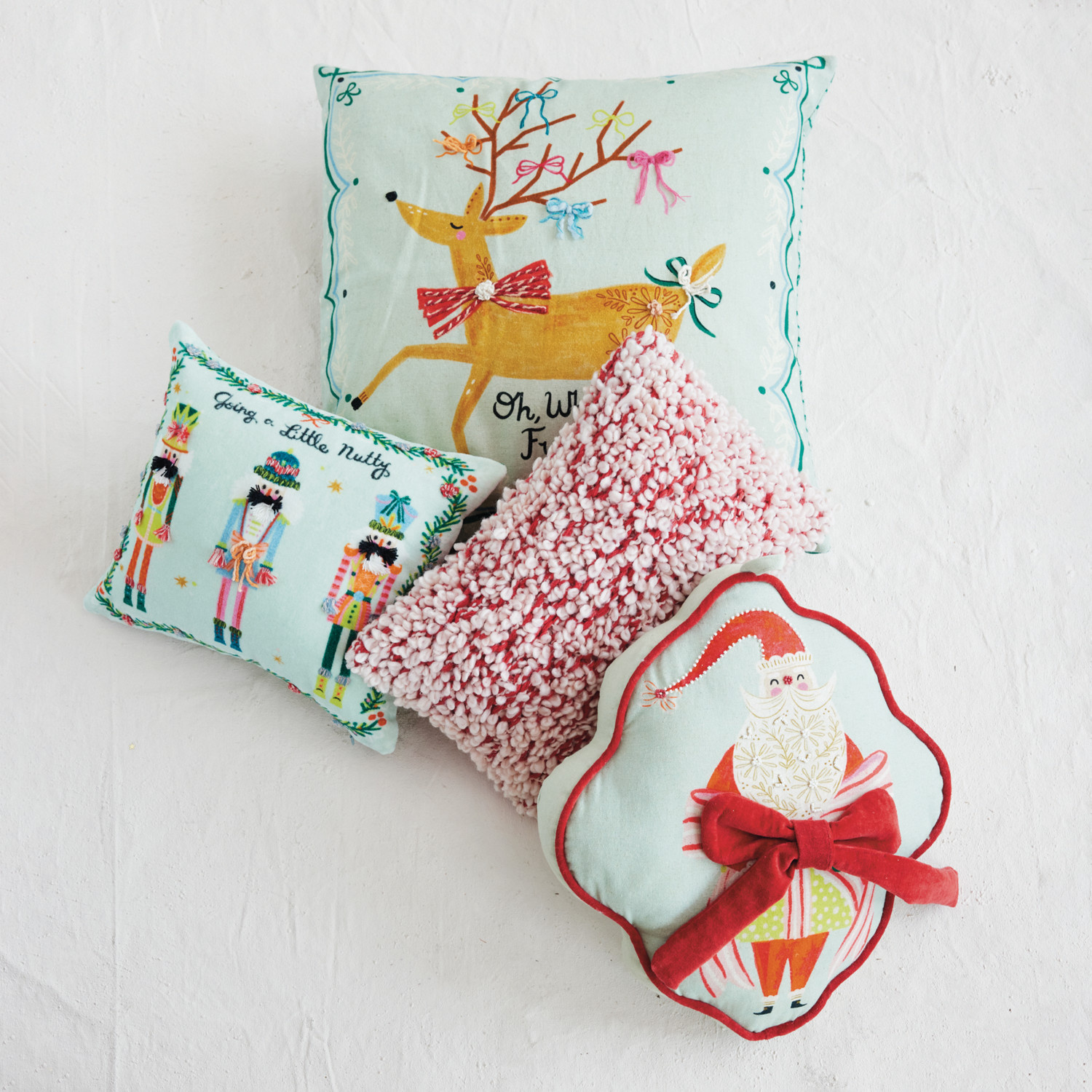 Catalog Name: 12"L x 10-1/2"H Cotton Velvet Printed Lumbar Pillow w/ Embroidered Nutcrackers, Botanical Border & Patterned Cotton Linen Back "Going A Little Nutty", Multi Color ©