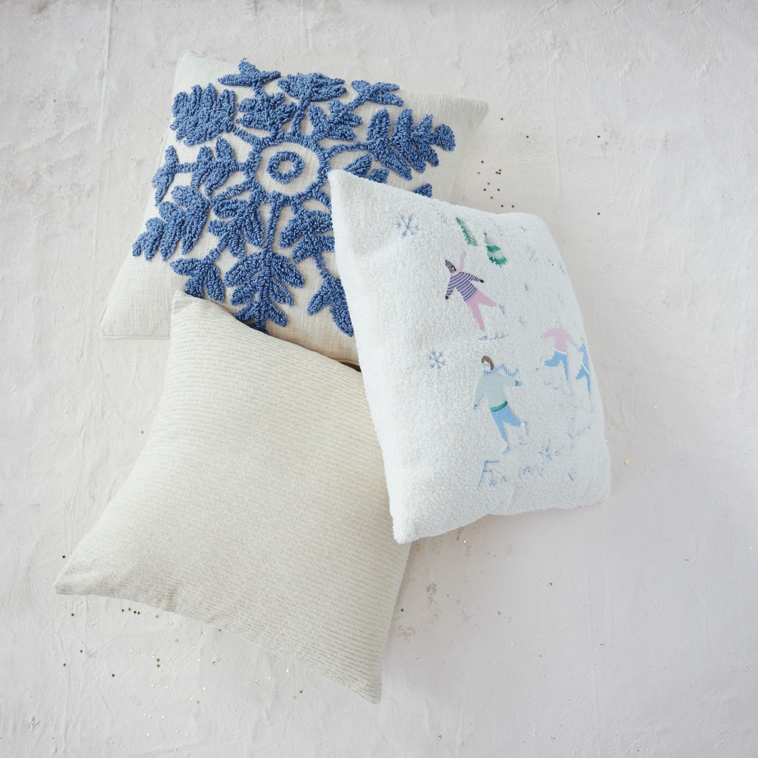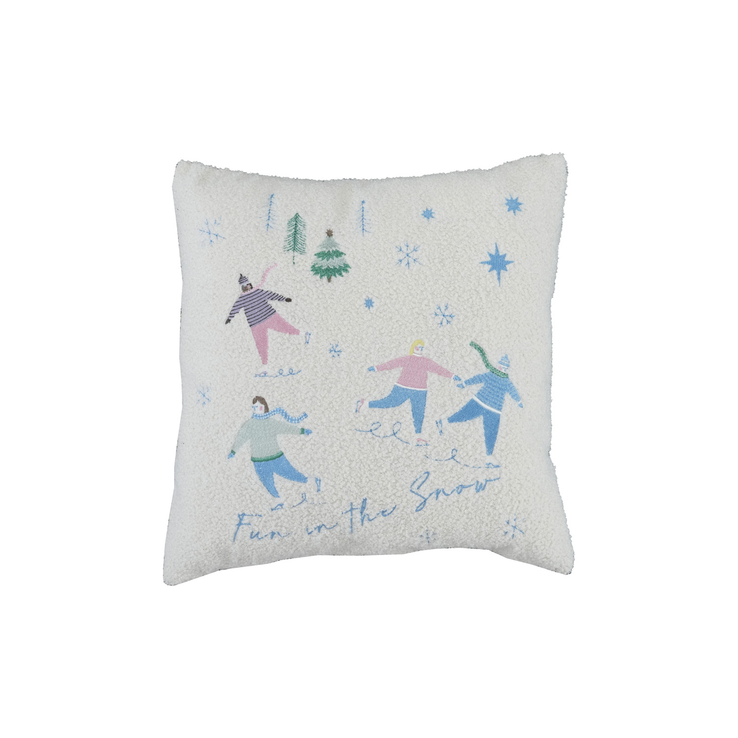 Catalog Name: 18" Square Faux Sherpa Pillow w/ Embroidered Ice Skaters "Fun in the Snow", Multi Color