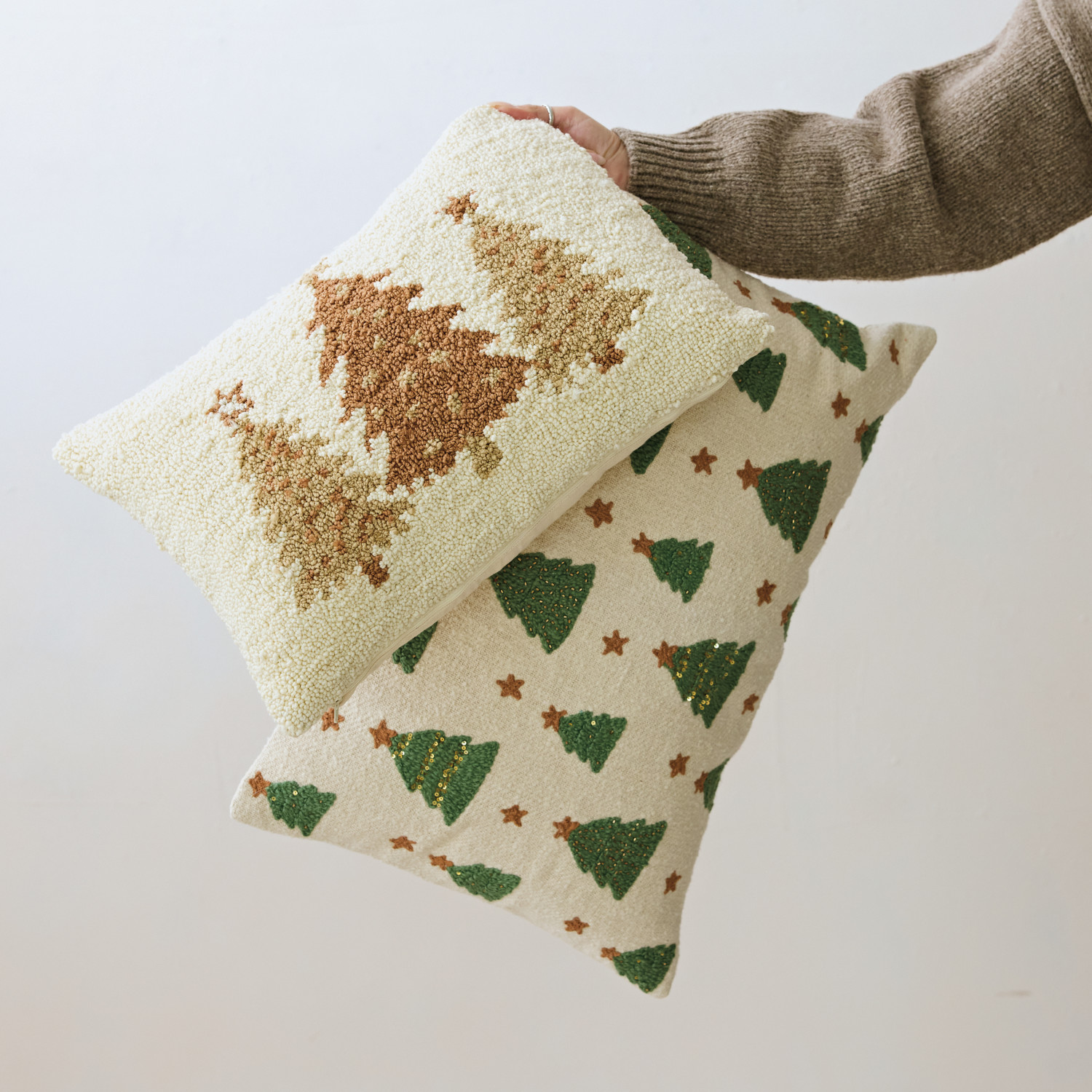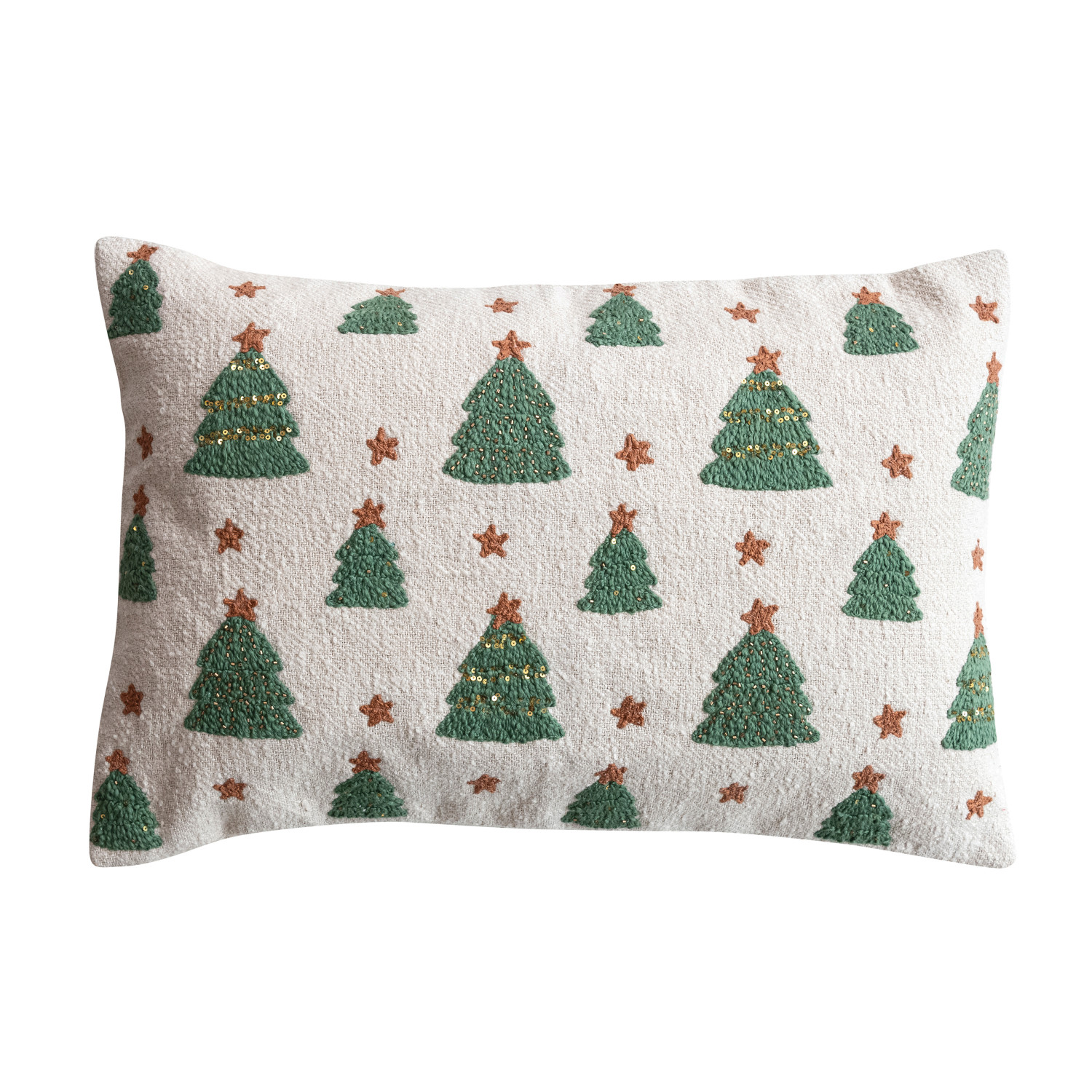 Woven Cotton Lumbar Pillow with Tufted Christmas Trees, Embroidery & Beads