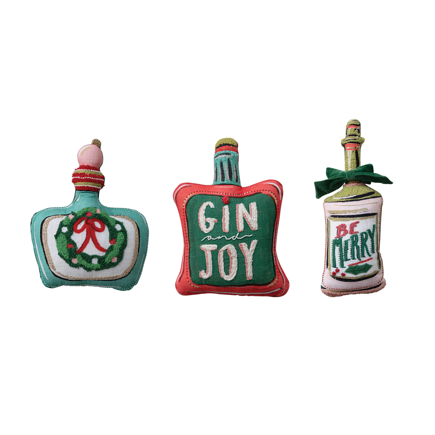 Catalog Name: 12"H - 18-1/2"H Cotton Printed Bottle Shaped Pillow w/ Tufting, Embroidery, Applique, Wreath/Bow, Beads & Velvet Back, Multi Color, 3 Styles ©