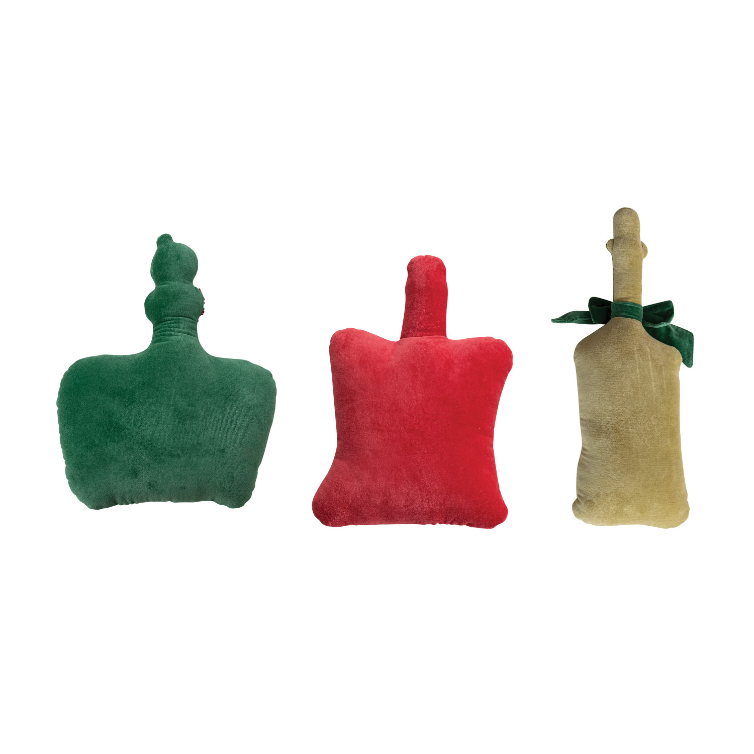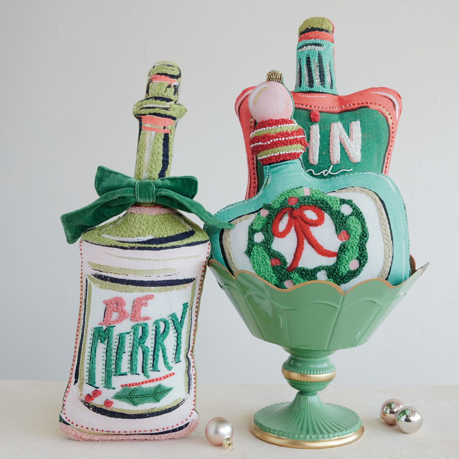 Catalog Name: 12"H - 18-1/2"H Cotton Printed Bottle Shaped Pillow w/ Tufting, Embroidery, Applique, Wreath/Bow, Beads & Velvet Back, Multi Color, 3 Styles ©