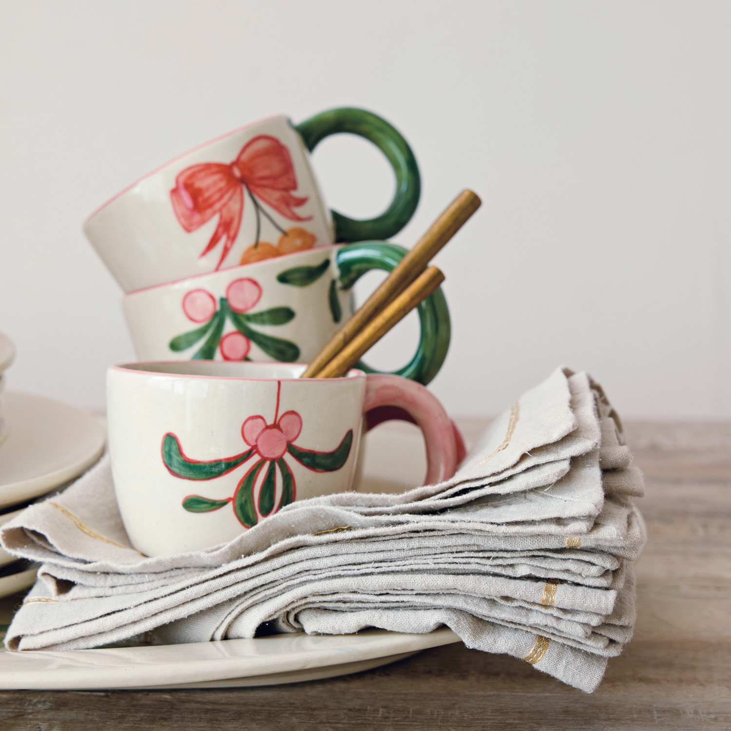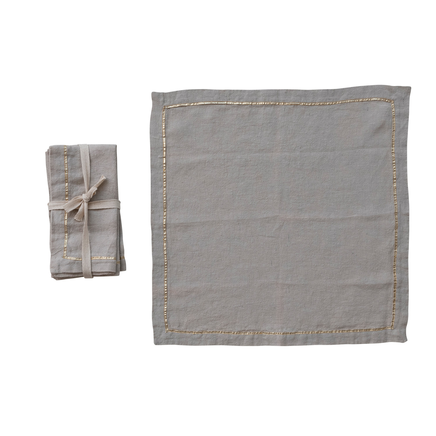 Catalog Name: 18" Square Linen Napkins w/ Metallic Gold Thread Embroidered Border, Natural, Set of 4 Tied w/ Cotton Tape