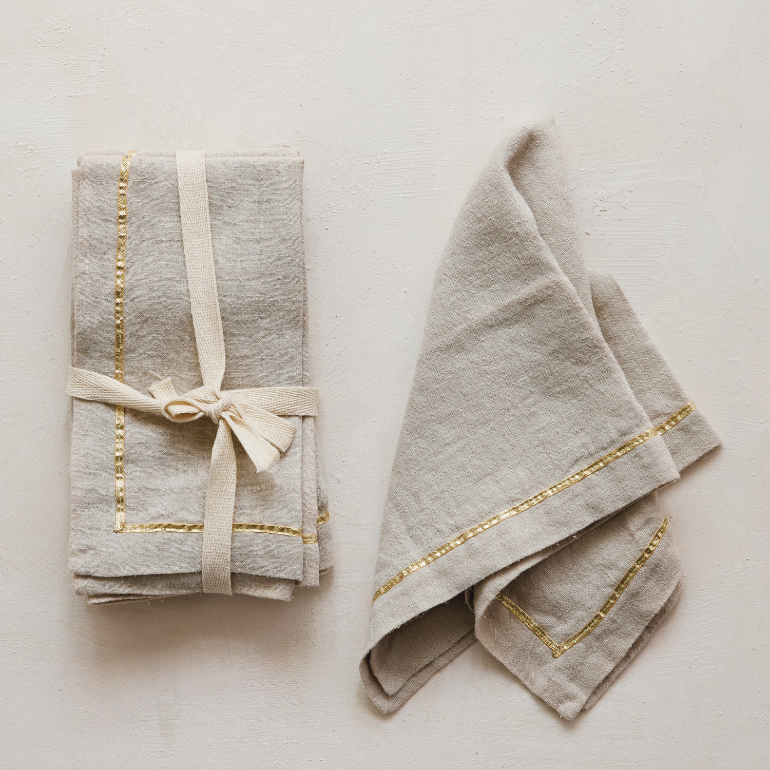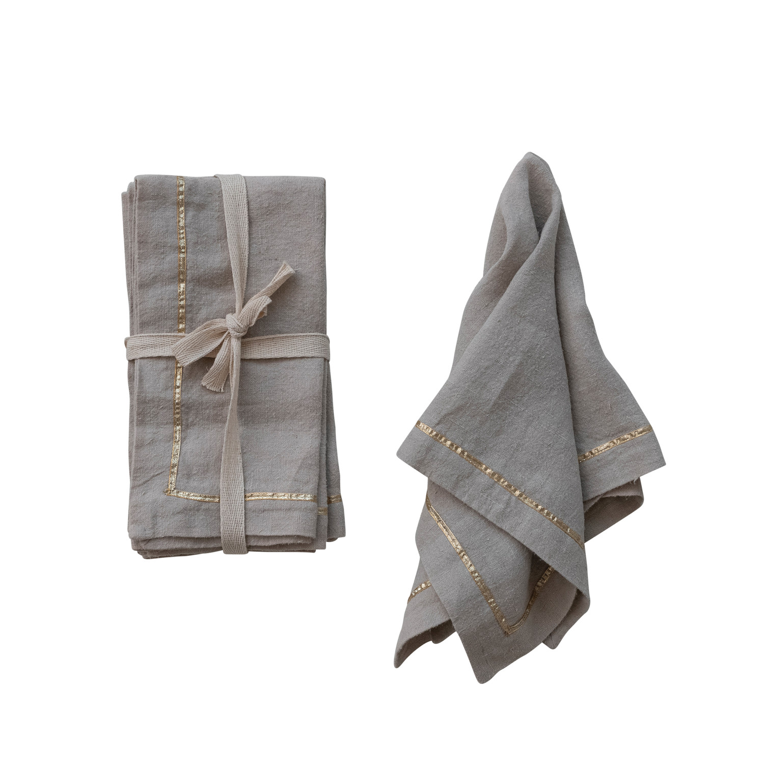 Linen Napkins with Metallic Gold Thread Embroidered Border, Set of 4 Tied with Cotton Tape