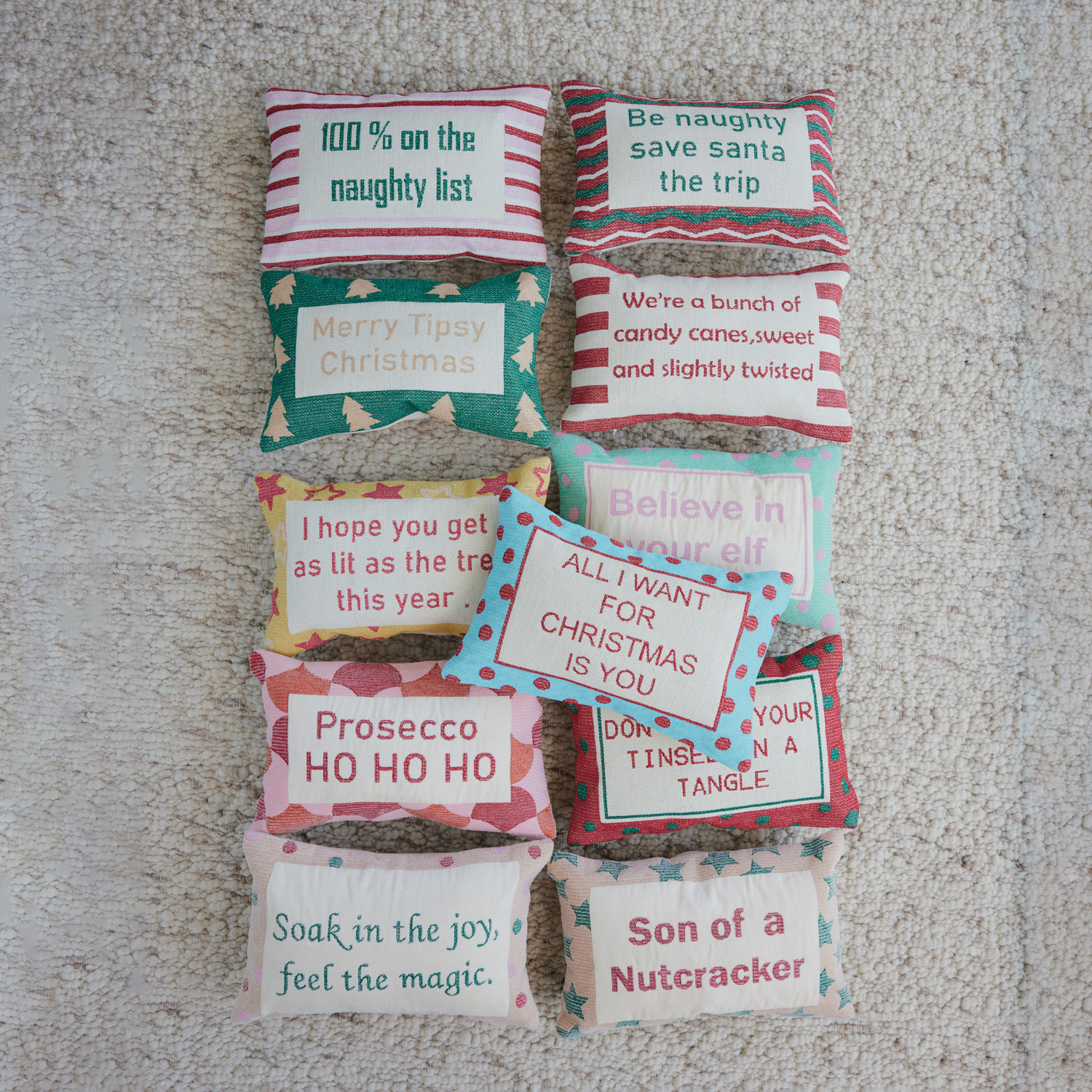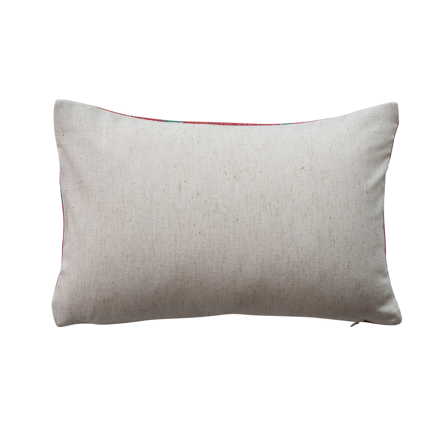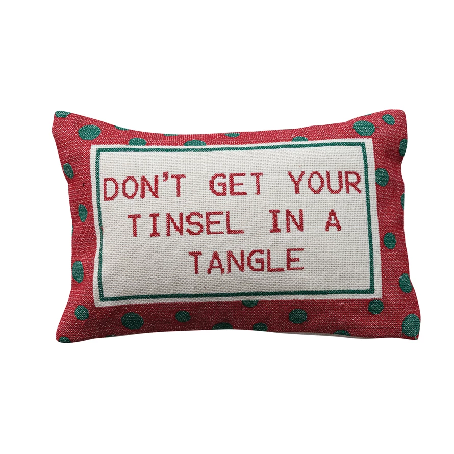 Catalog Name: 14"L x 9"H Cotton Embroidered Lumbar Pillow w/ Polka Dot Pattern "Don't Get Your Tinsel...", Red, Green & Natural