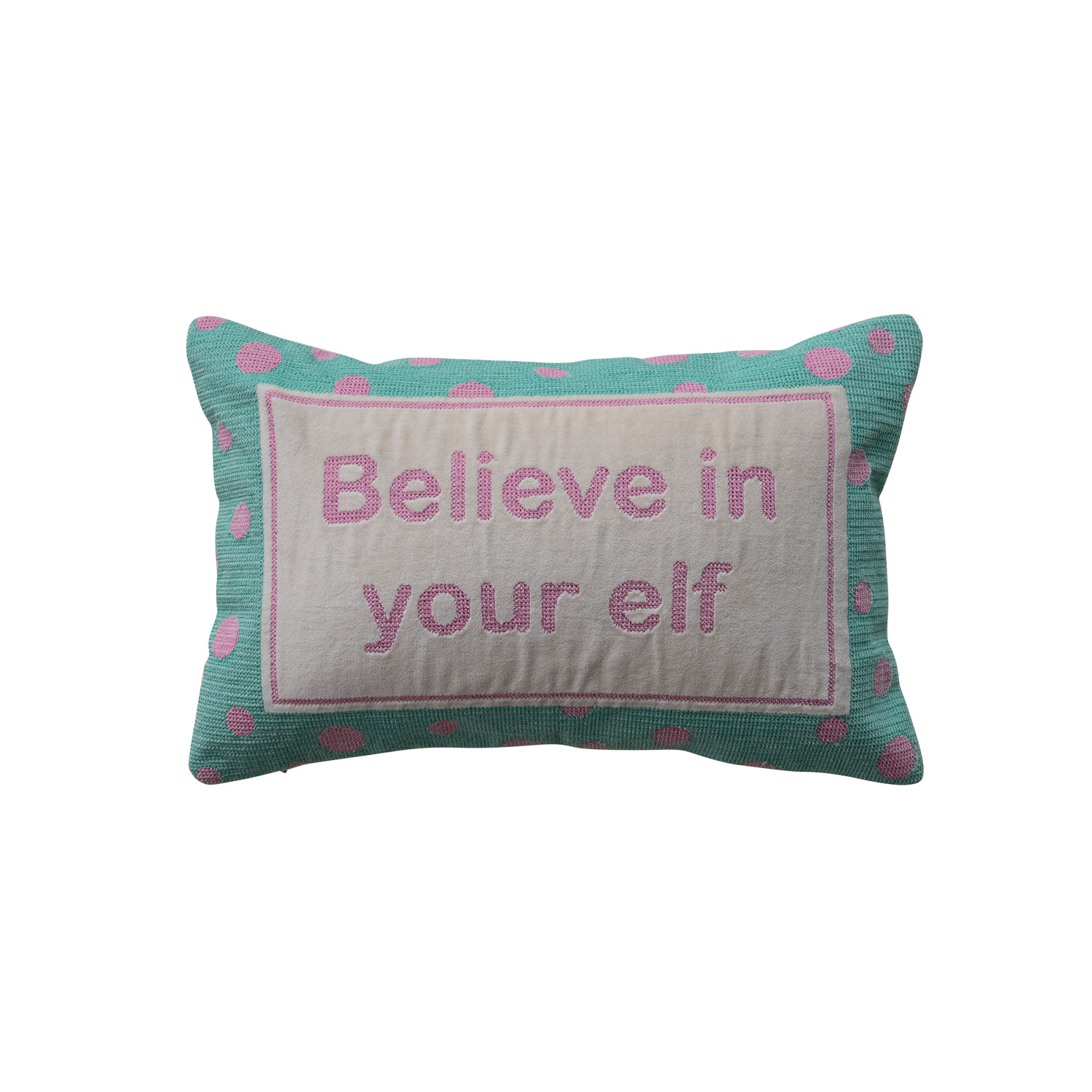 Catalog Name: 14"L x 9"H Cotton & Velvet Embroidered Lumbar Pillow w/ Polka Dot Pattern "Believe In Your Elf", Mint Color, Pink & Natural