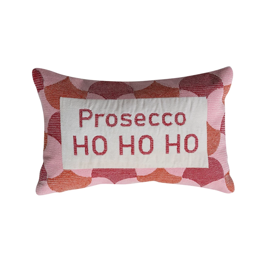 Cotton & Velvet Embroidered Lumbar Pillow with Geometric Pattern "Prosecco HO HO HO"