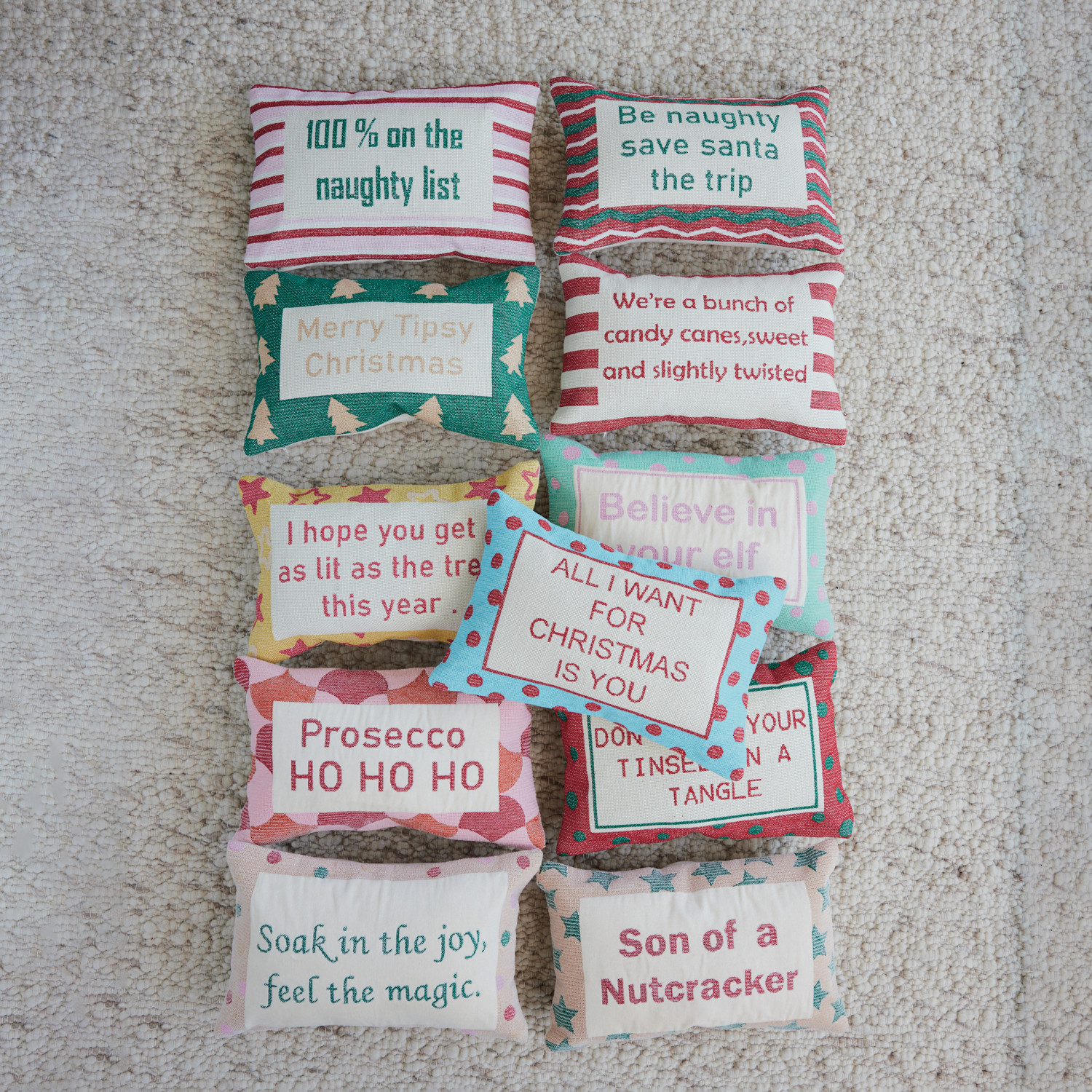 Cotton Embroidered Lumbar Pillow with Stripes "We're A Bunch Of Candy Canes..."