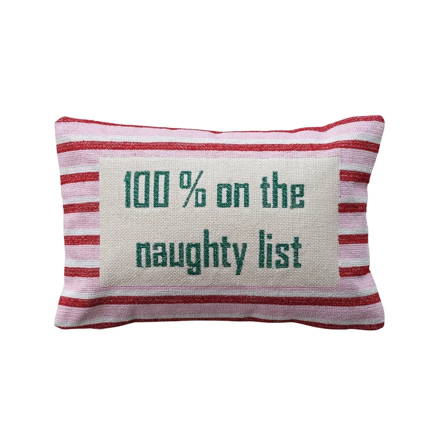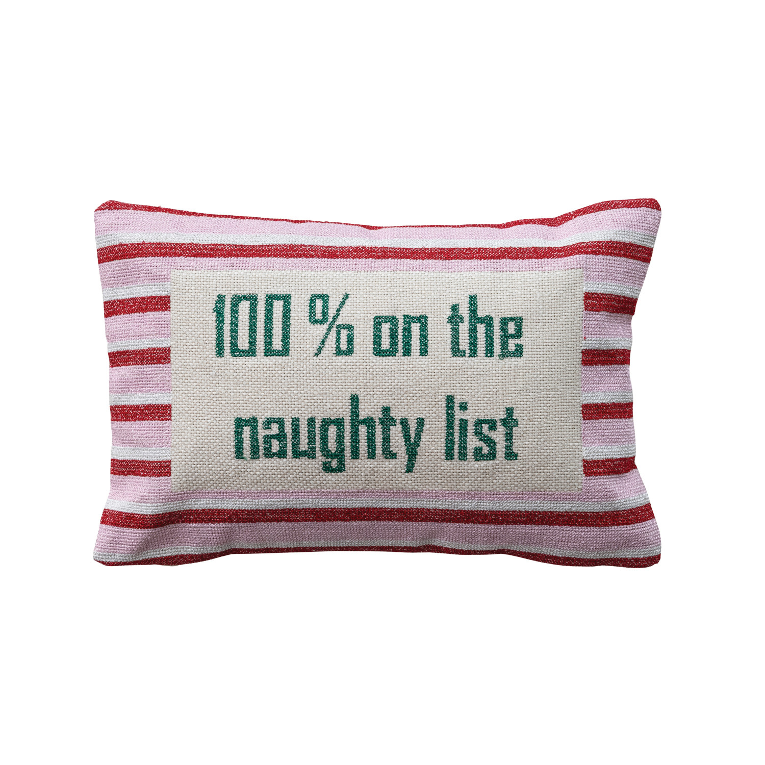 Cotton Embroidered Lumbar Pillow with Stripes "100% On The Naughty List"