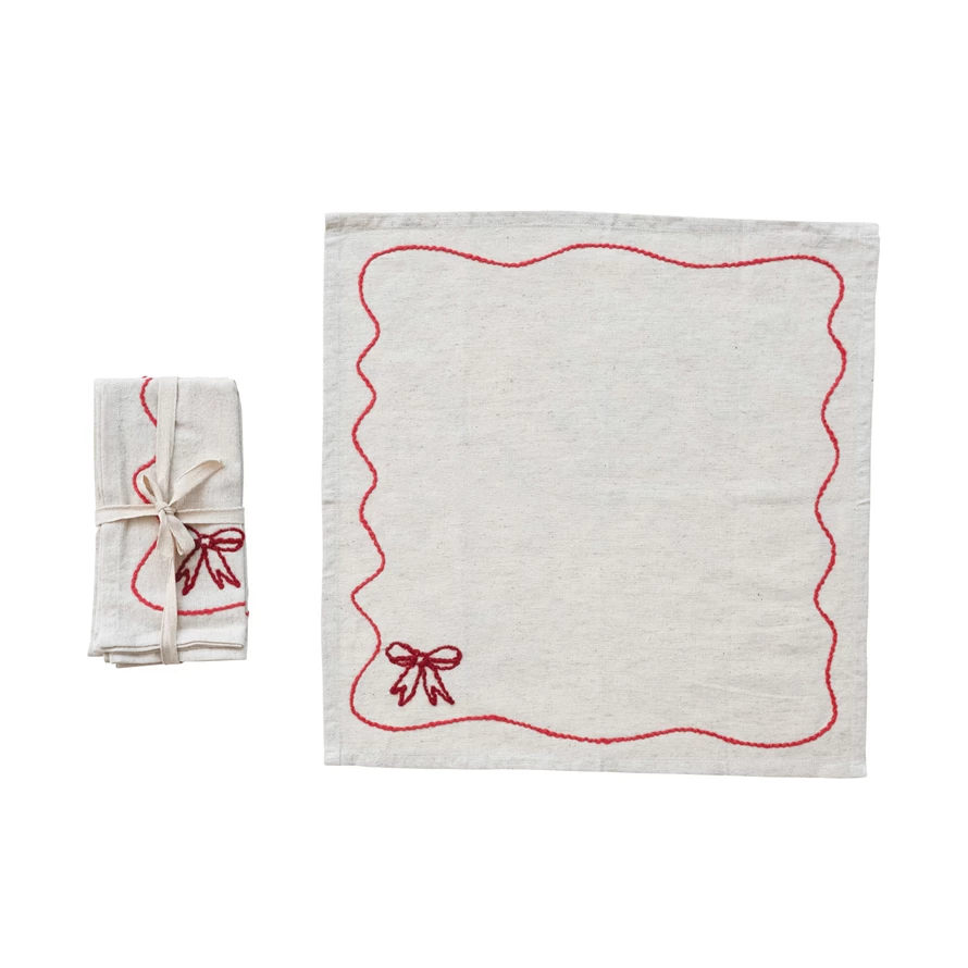 Catalog Name: 18" Square Cotton & Linen Napkins w/ Embroidered Bow & Scalloped Border, Natural & Red, Set of 4 Tied w/ Cotton Tape