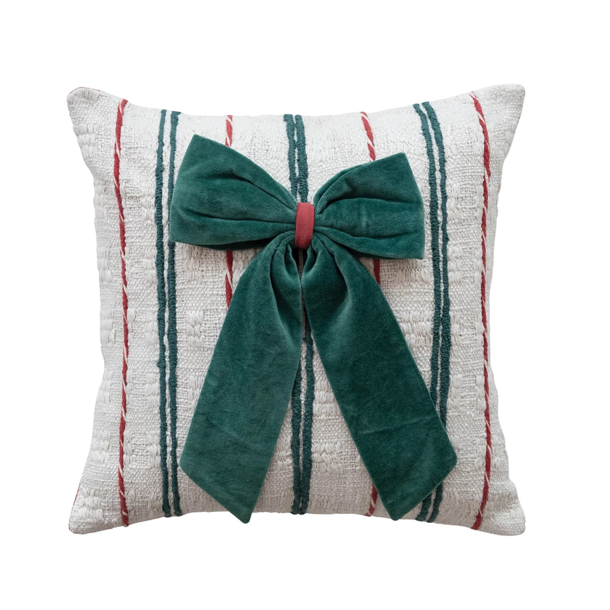 Catalog Name: 18" Square Cotton Slub Pillow w/ Embroidered Stripes & Velvet Bow, Natural, Green & Red