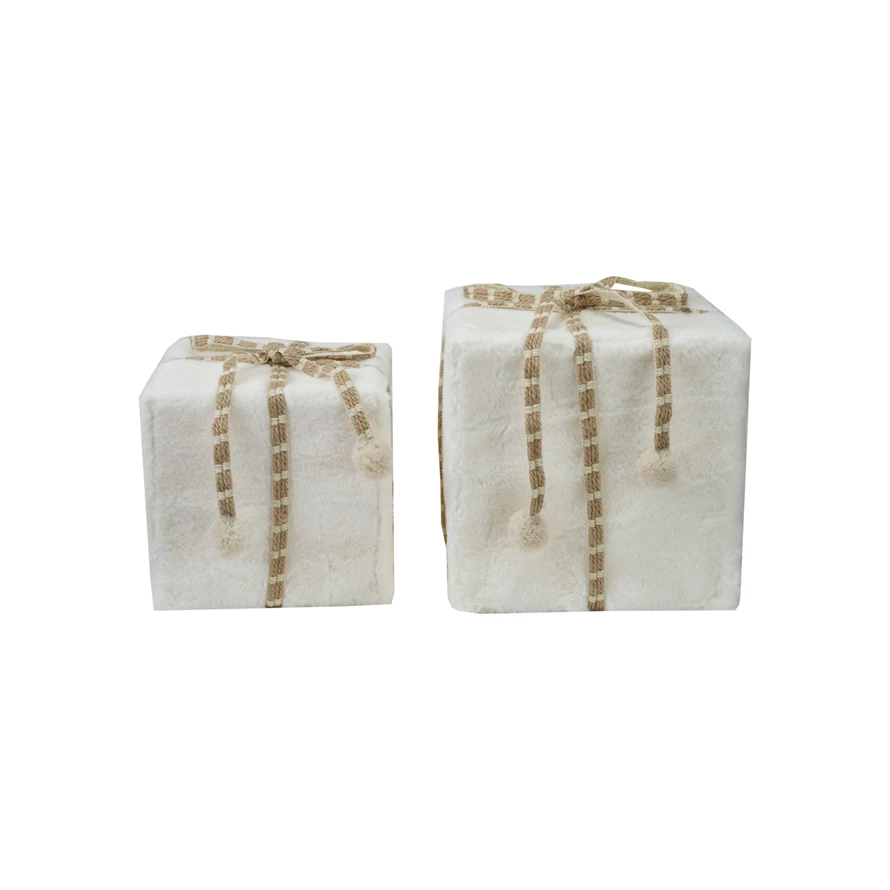 Decorative Fabric & Foam Gift Boxes with Knit Bows & Pom Poms, White & Natural, Set of 2