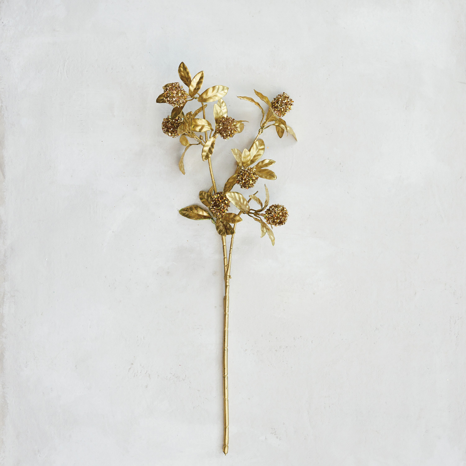 Faux Berry & Leaves Stem with Glitter, Gold Finish