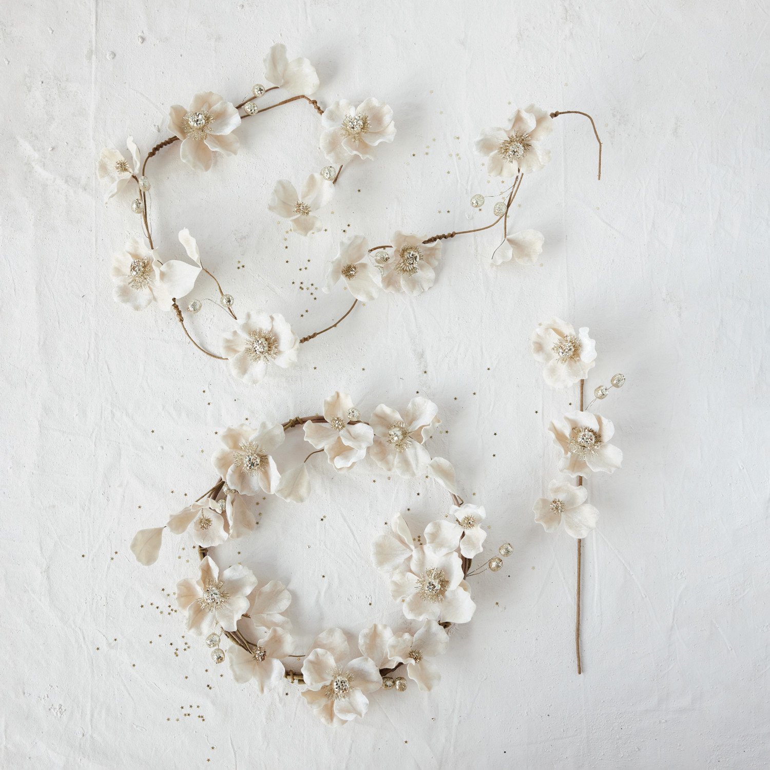 Faux Magnolia Flower Stem with Glitter & Jewels, Blush Color