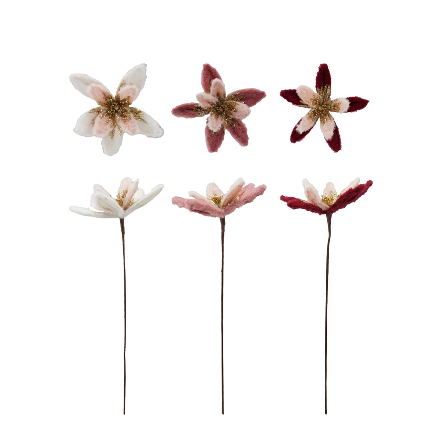 Faux Fur Poinsettia Stem with Glitter & Beads, 3 Colors