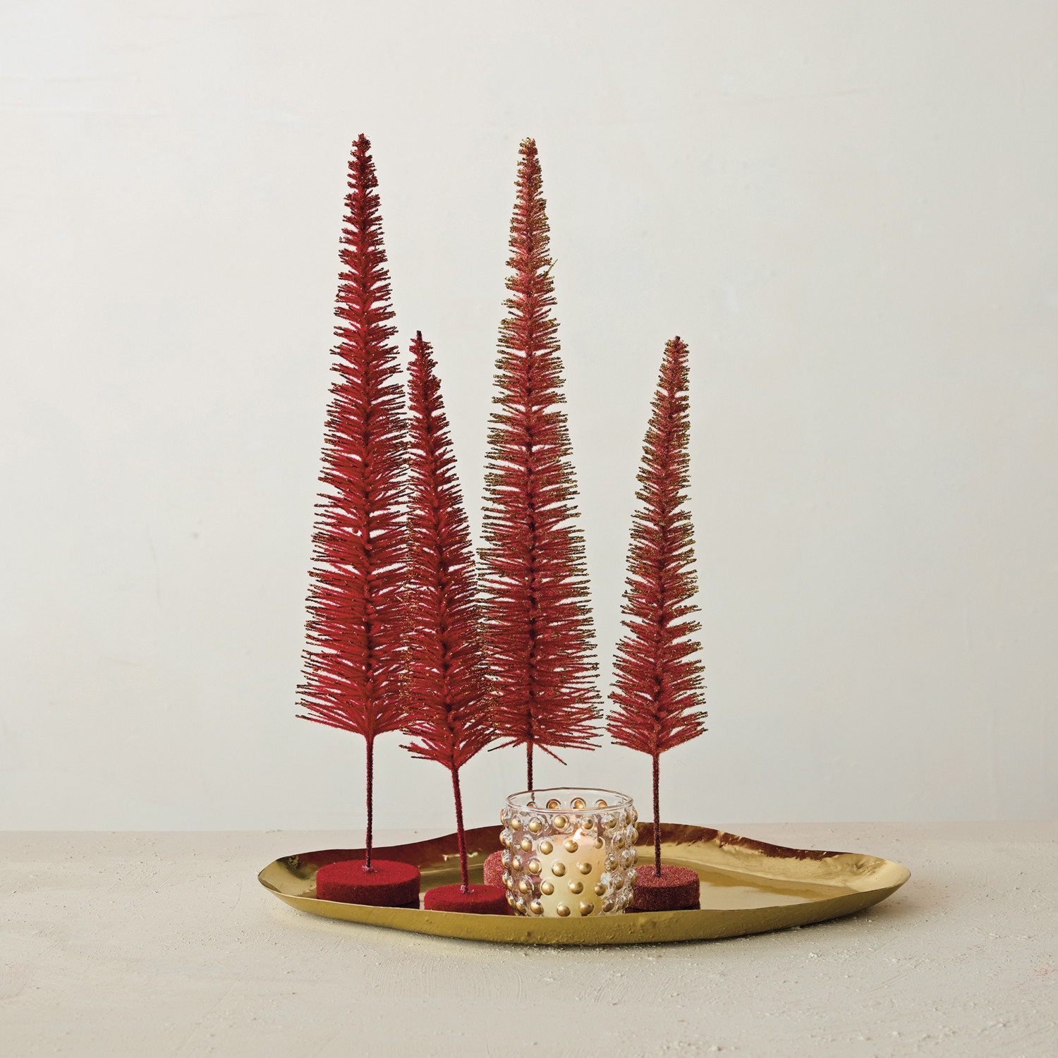 Flocked Plastic Bottle Brush Tree with Glitter, Red & Gold Finish