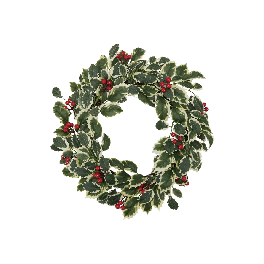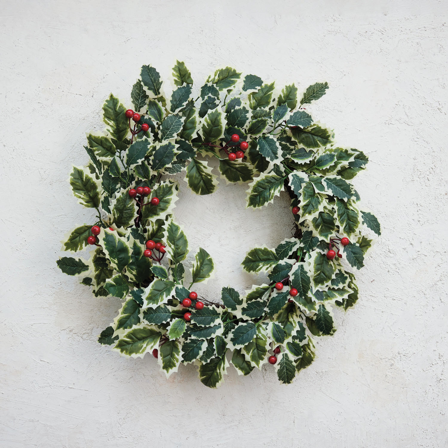 22" Round Faux Variegated Holly Wreath with Red Berries
