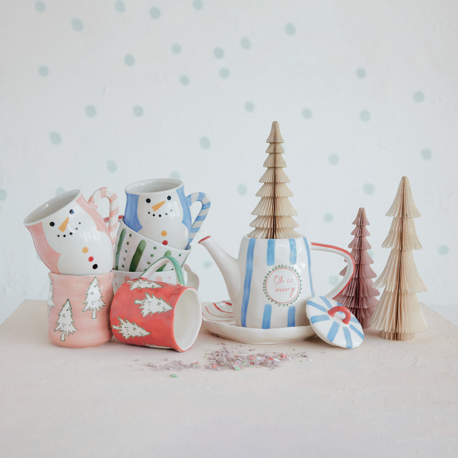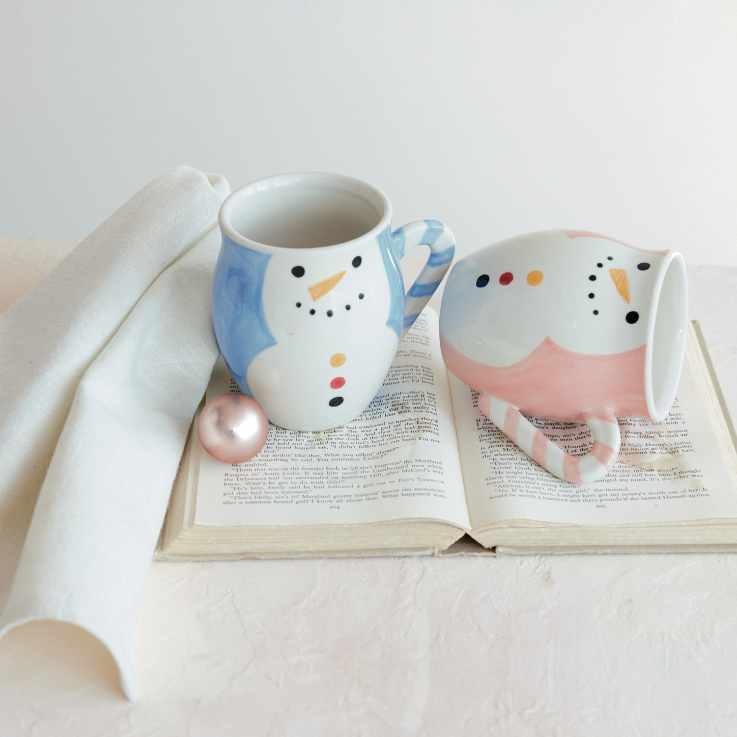 14 oz. Hand-Painted Stoneware Mug with Snowman & Candy Cane Handle, 2 Colors