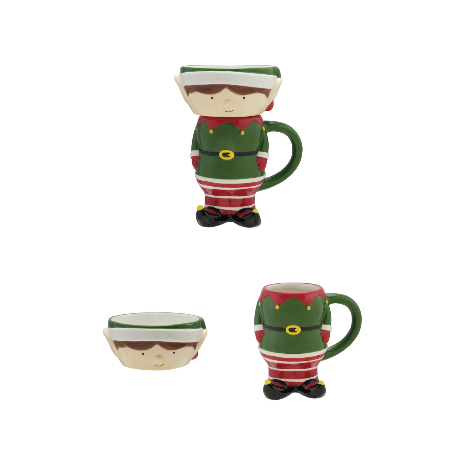 18 oz. Hand-Painted Ceramic Elf Shaped Mug & Stackable Bowl, Set of 2