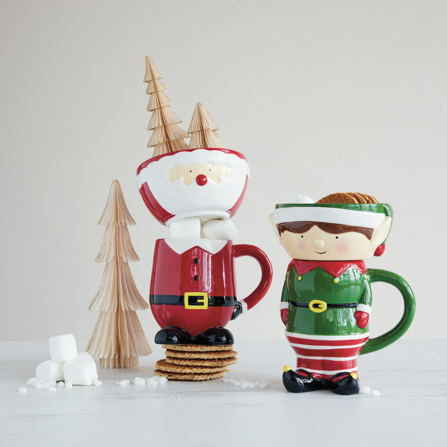 Catalog Name: 4-1/4" Round x 4-3/4"H 18 oz. Hand-Painted Ceramic Elf Shaped Mug & 5" Round x 2-1/2"H Stackable Bowl, Multi Color, Set of 2