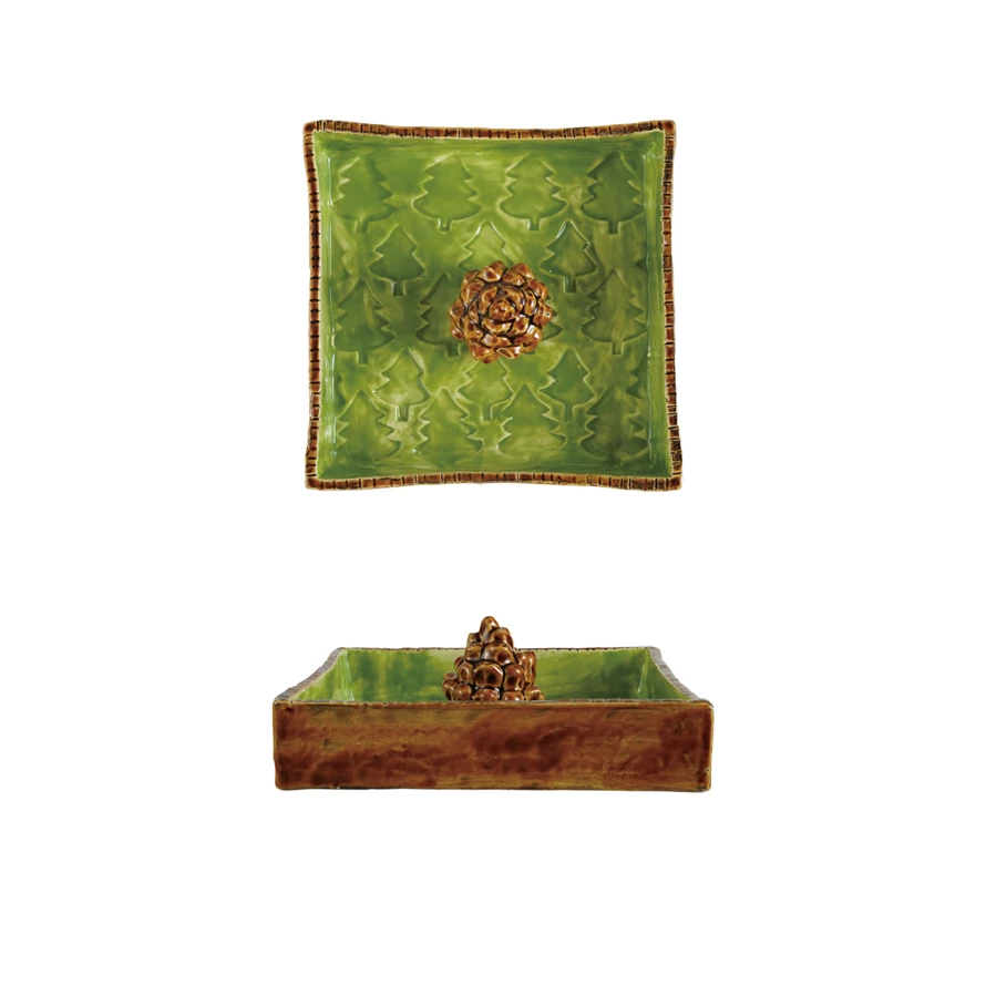Catalog Name: 7-1/4" Square x 2-1/2"H Hand-Painted Stoneware Napkin Holder w/ Trees Pattern & Pinecone Shaped Weight, Brown & Green, Set of 2 (Holds 6" Square Napkin) ©