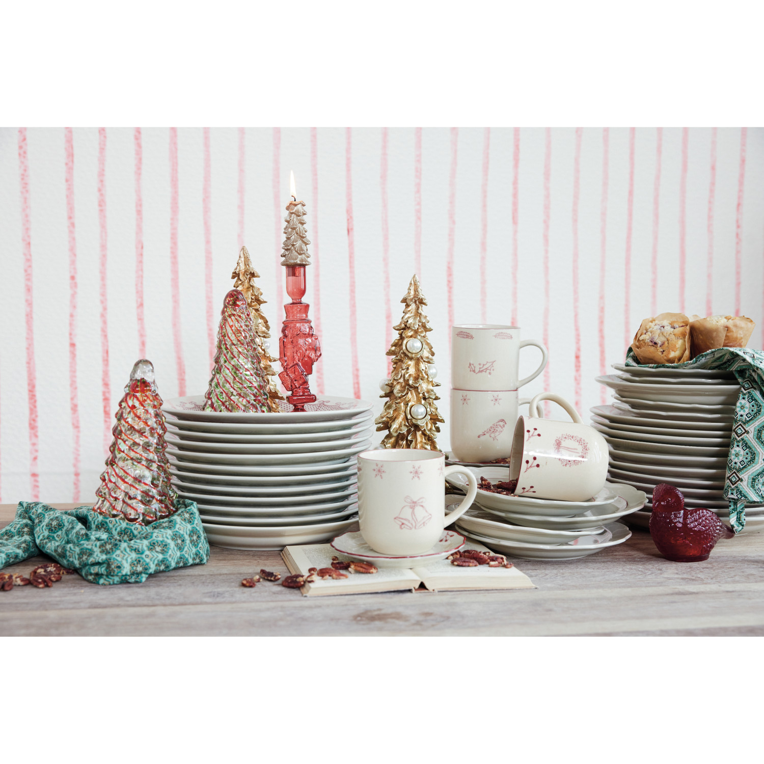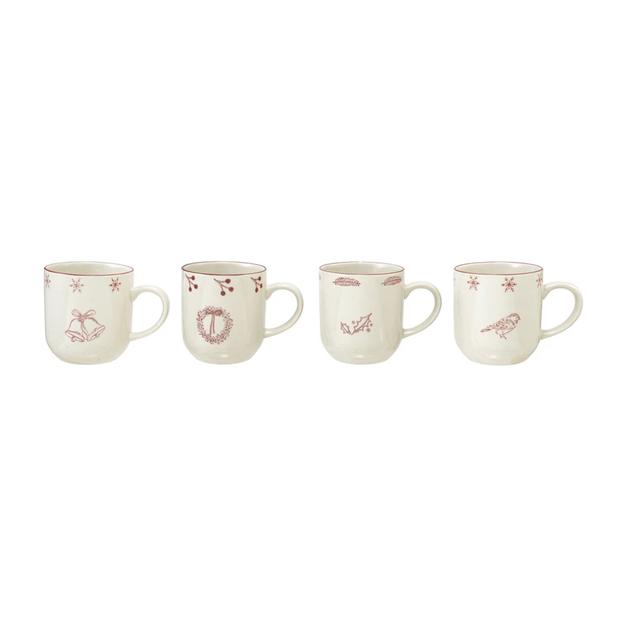 12 oz. Hand-Stamped Stoneware Mug with Holiday Image, White & Burgundy, 4 Styles