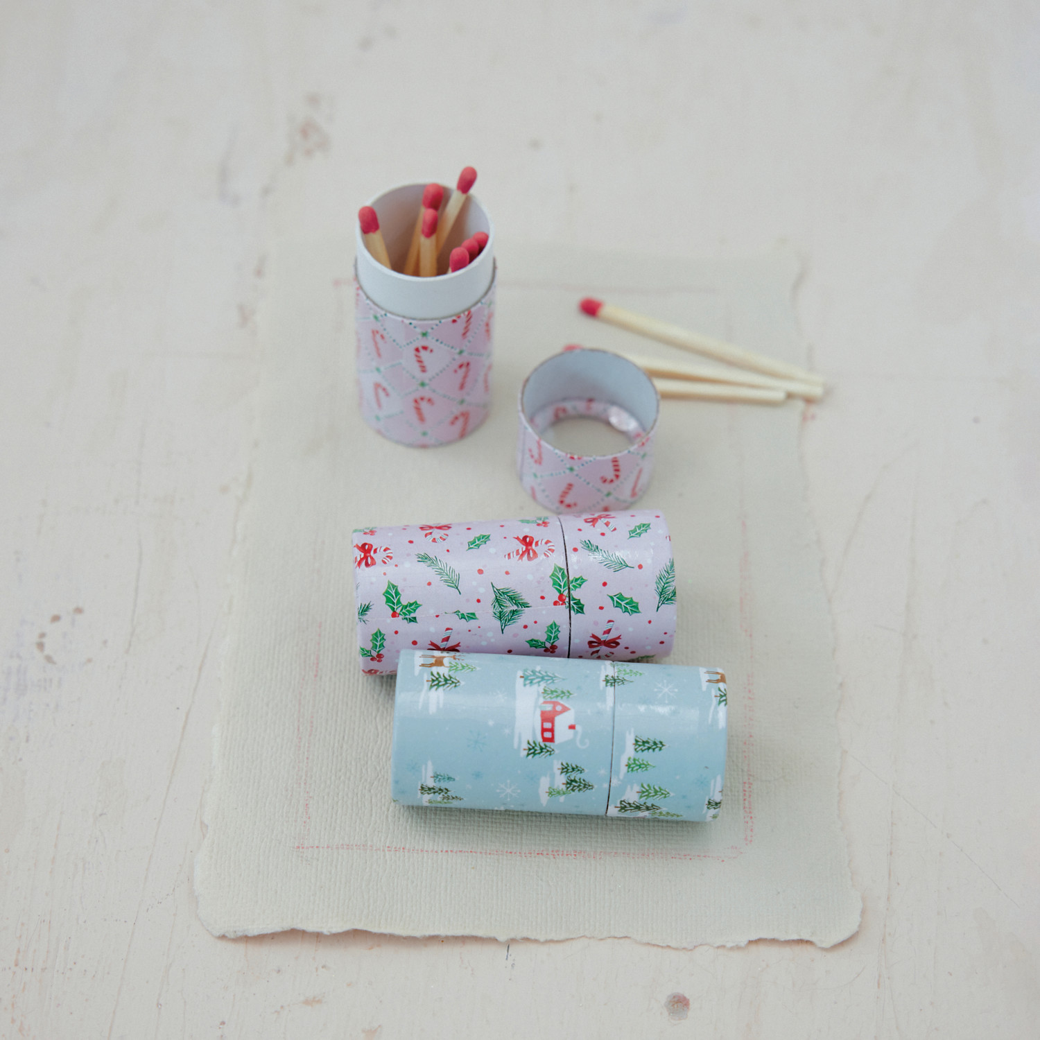 Safety Matches in Tube Matchbox with Holiday Pattern, 3 Styles ©