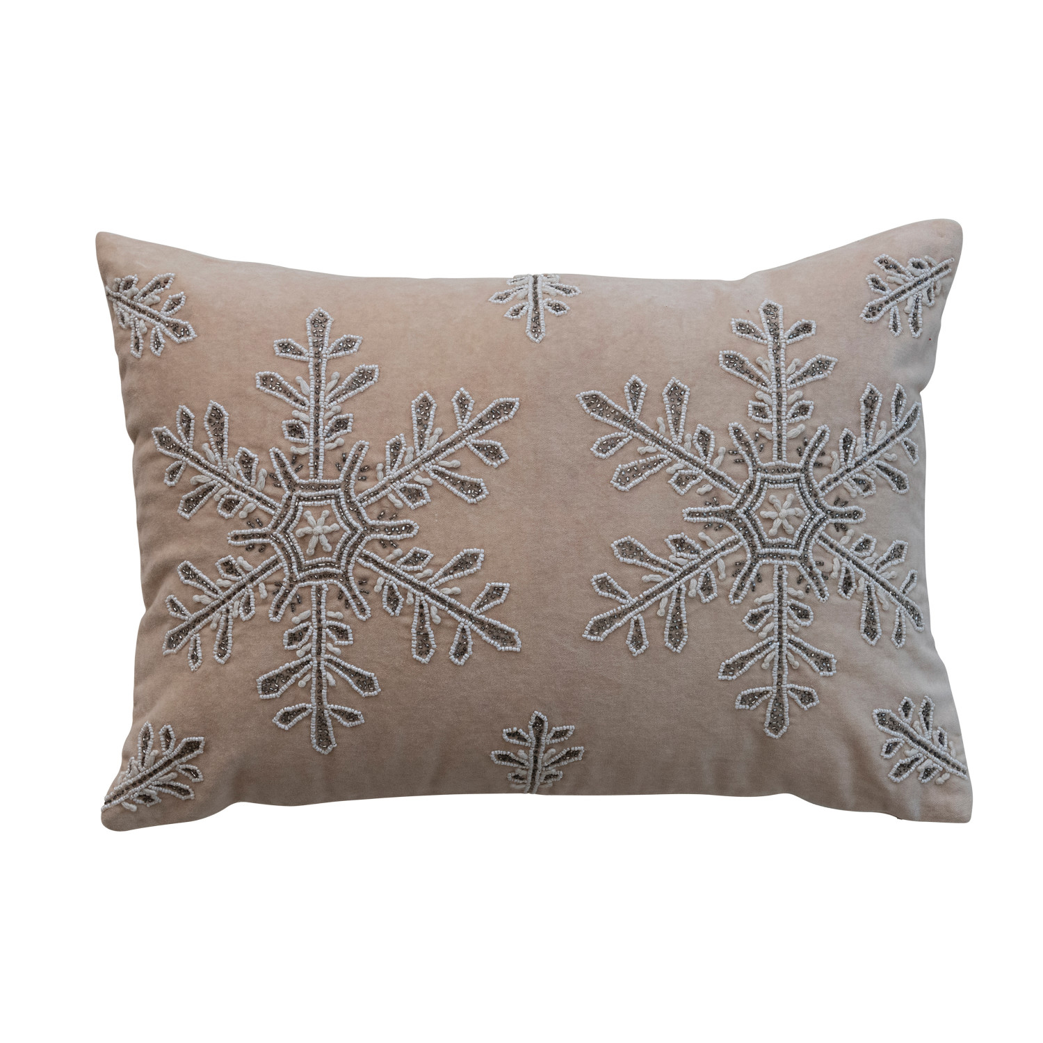 Cotton Velvet Lumbar Pillow with Snowflakes, Embroidery, Beads & Cotton Back