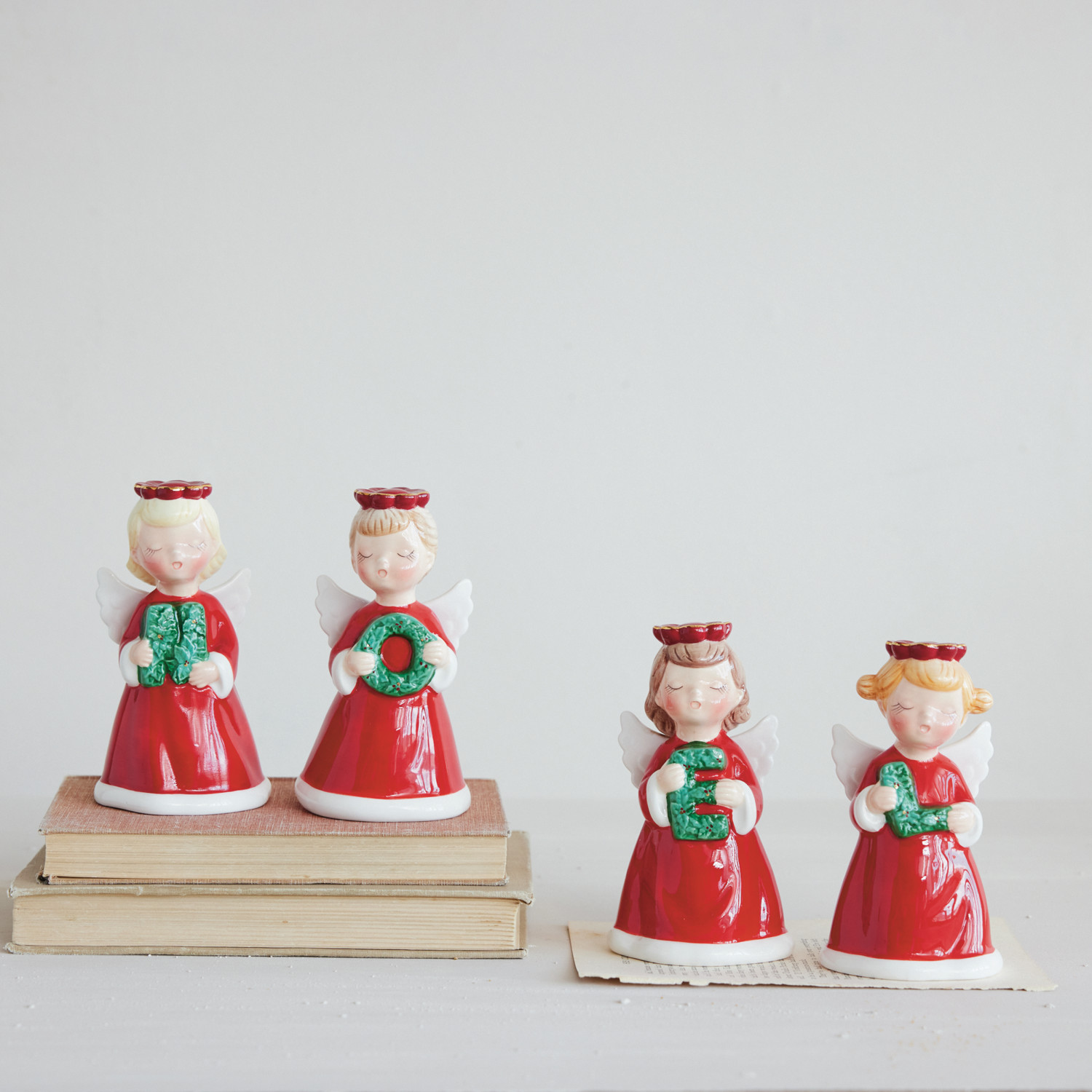 Catalog Name: 2-1/2" Round x 5-1/4"H Ceramic Vintage Reproduction Angels w/ Letter Shaped Wreaths "Noel", Multi Color, Set of 4